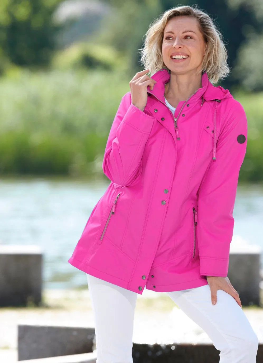 Fantastische Funktionsjacke: Durchzugsband und Stopper in der Kapuze und in der Taille, durch Reißverschluss unter der teilweise verdeckten Druckerleiste hoch schließbarer Stehkragen, Reißverschlusstaschen, umschlagbare Ärmel, Reißverschluss an den Seitenschlitzen sowie eine Innentasche. Länge ca. 76 cm, ab Gr. 46 ca. 78 cm, ab Gr. 50 ca. 80 cm.