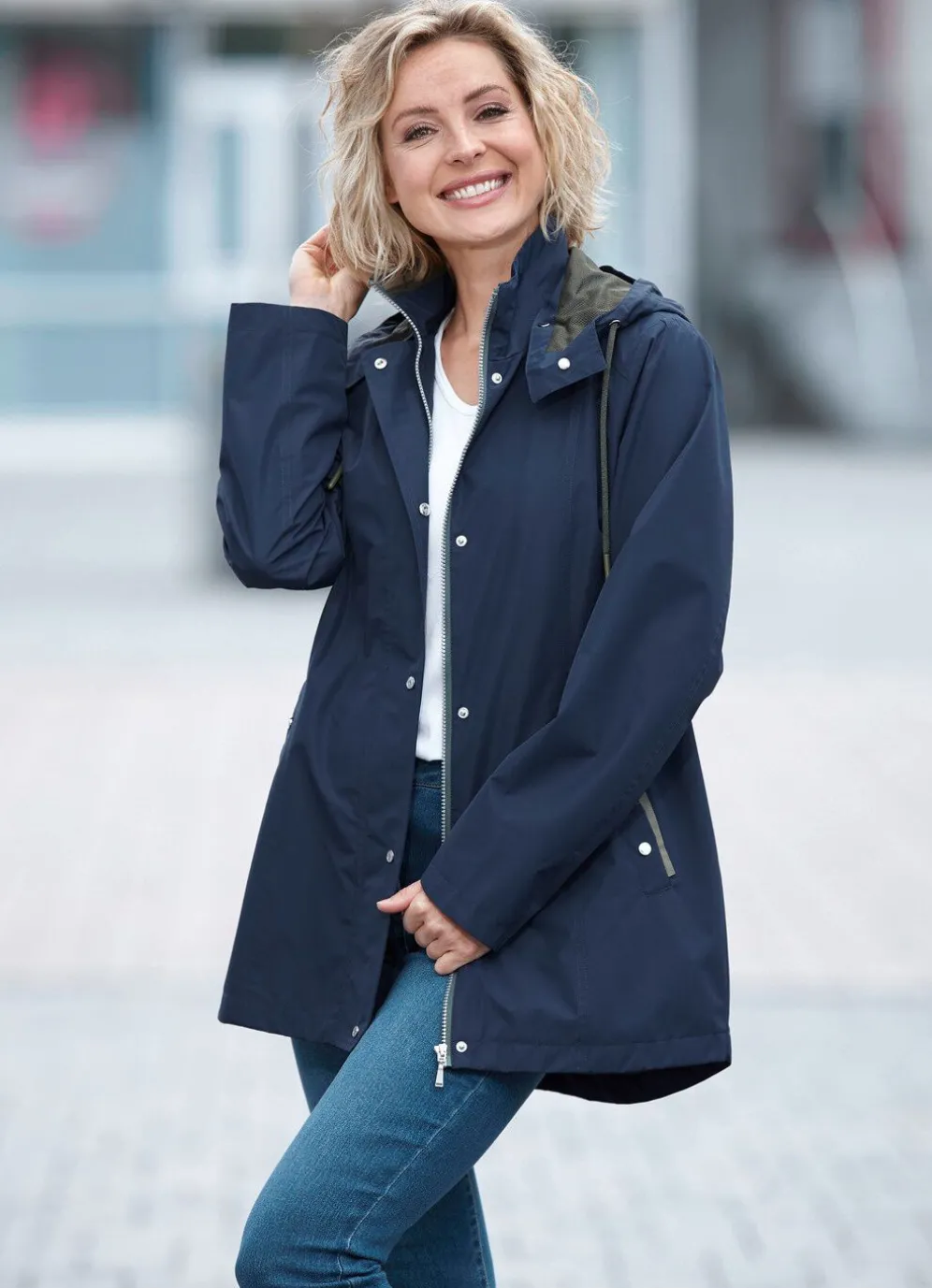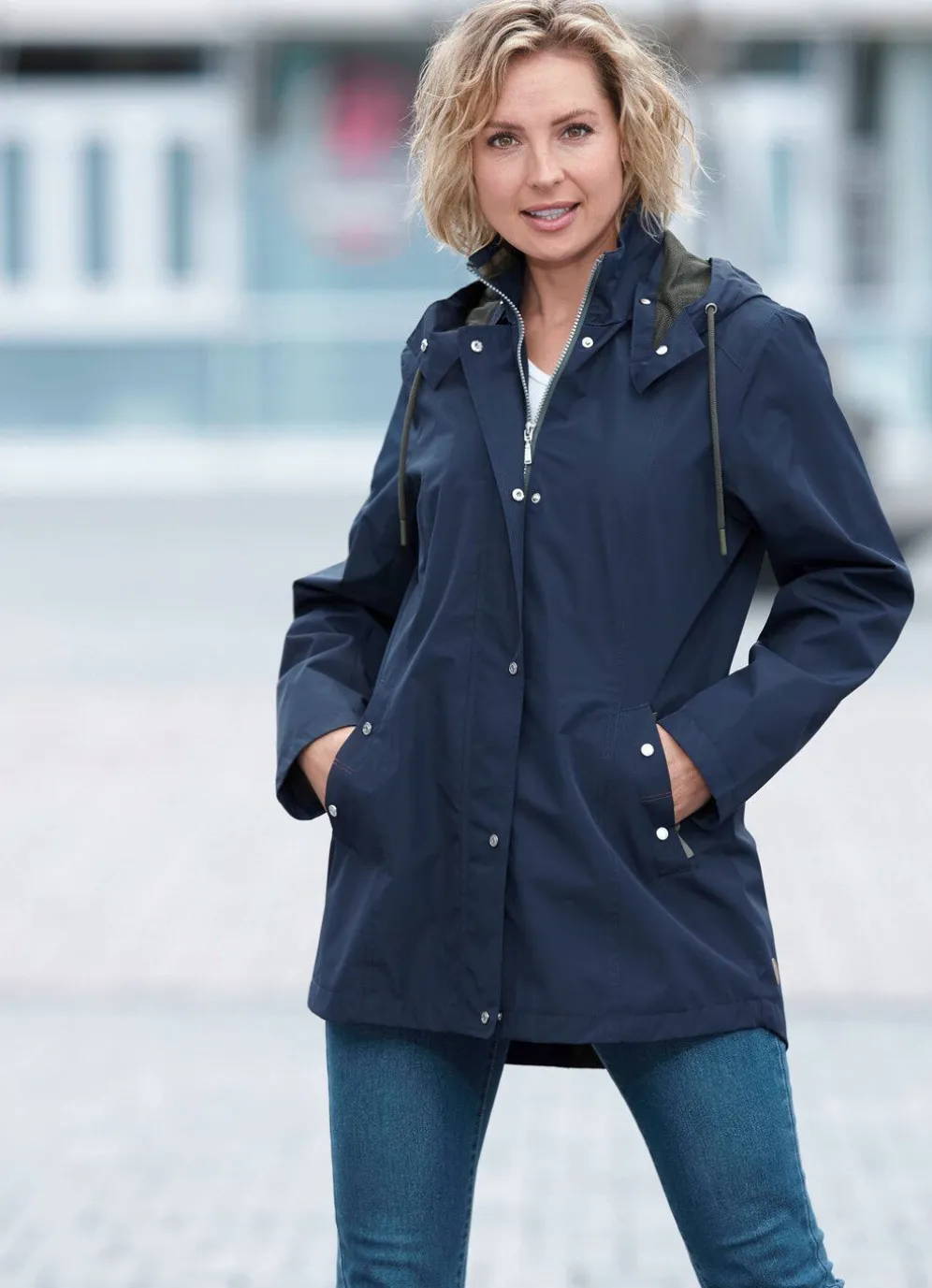 Funktionsjacke: abnehmbare Kapuze mit Riegel, Drucker, Durchzugsband und kleinem Regenschild, durch Reißverschluss unter der Druckerleiste hoch schließbarer Stehkragen, Schubtaschen mit Druckern, Durchzugsband und Stopper in der Taille, umschlagbare Ärmel, eine Innentasche sowie geschlitztes Rückteil mit Reißverschluss. Länge ca. 80 cm, ab Gr. 48 ca. 82 cm.