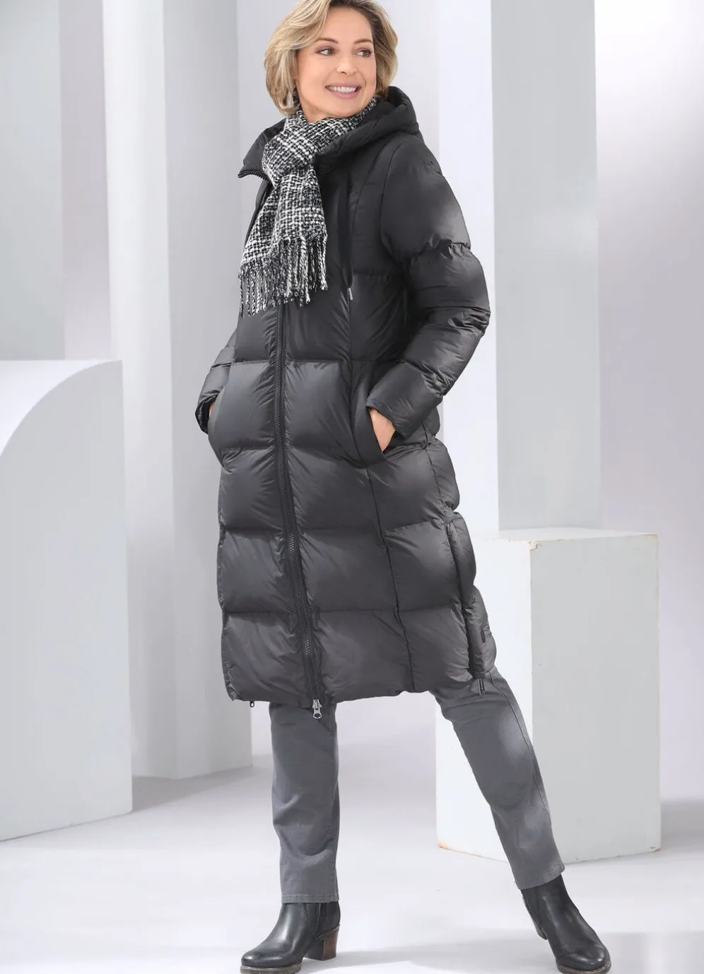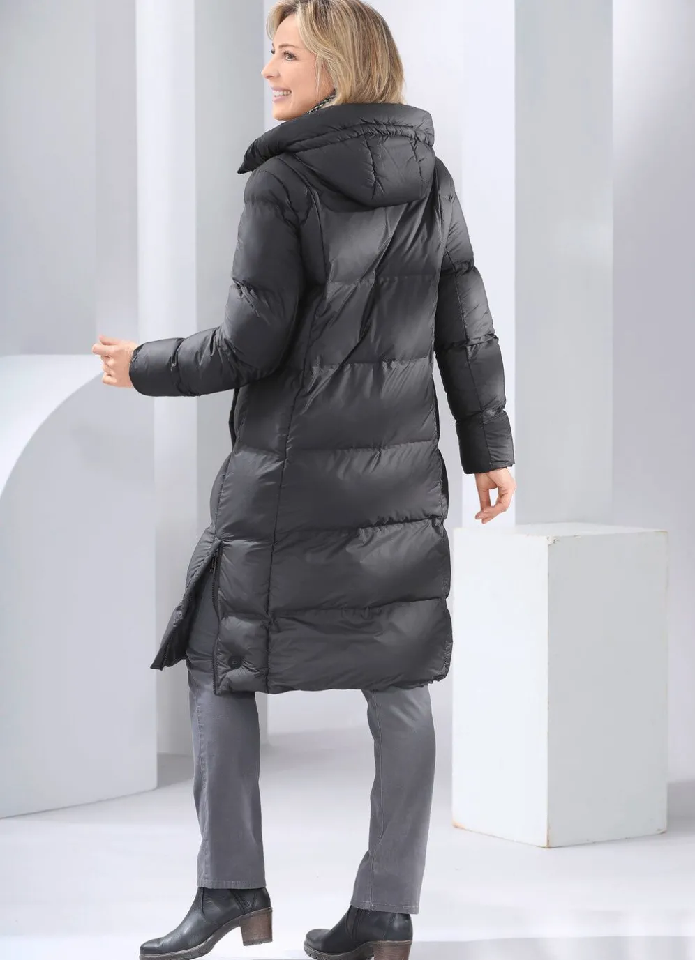 Schicker, schwarzer Funktionsmantel mit Kassettenstepp: feste Kapuze mit Bindeband, durch 2-Wege- Reißverschluss hoch schließbarer Stehkragen, Schubtaschen mit Blende, Reißverschluss an den Seitenschlitzen, Windfangärmeln aus Rippenstrick, einer Innentasche. Länge ca. 104 cm.