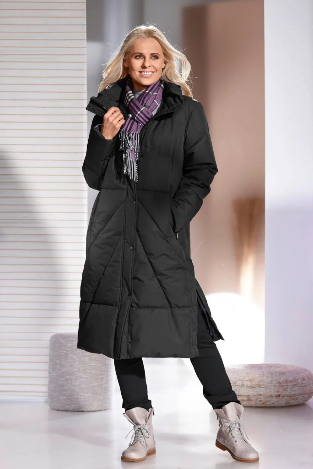 Geschmackvoller Funktionsmantel: im Kragen verstaubare, feste Kapuze mit Durchzugsband und Stopper, durch Reißverschluss unter der Druckerleiste hoch schließbarer Stehkragen, Paspeltaschen mit Reißverschluss, Seitenschlitze mit Druckern sowie eine Innentasche. Länge ca. 104 cm.