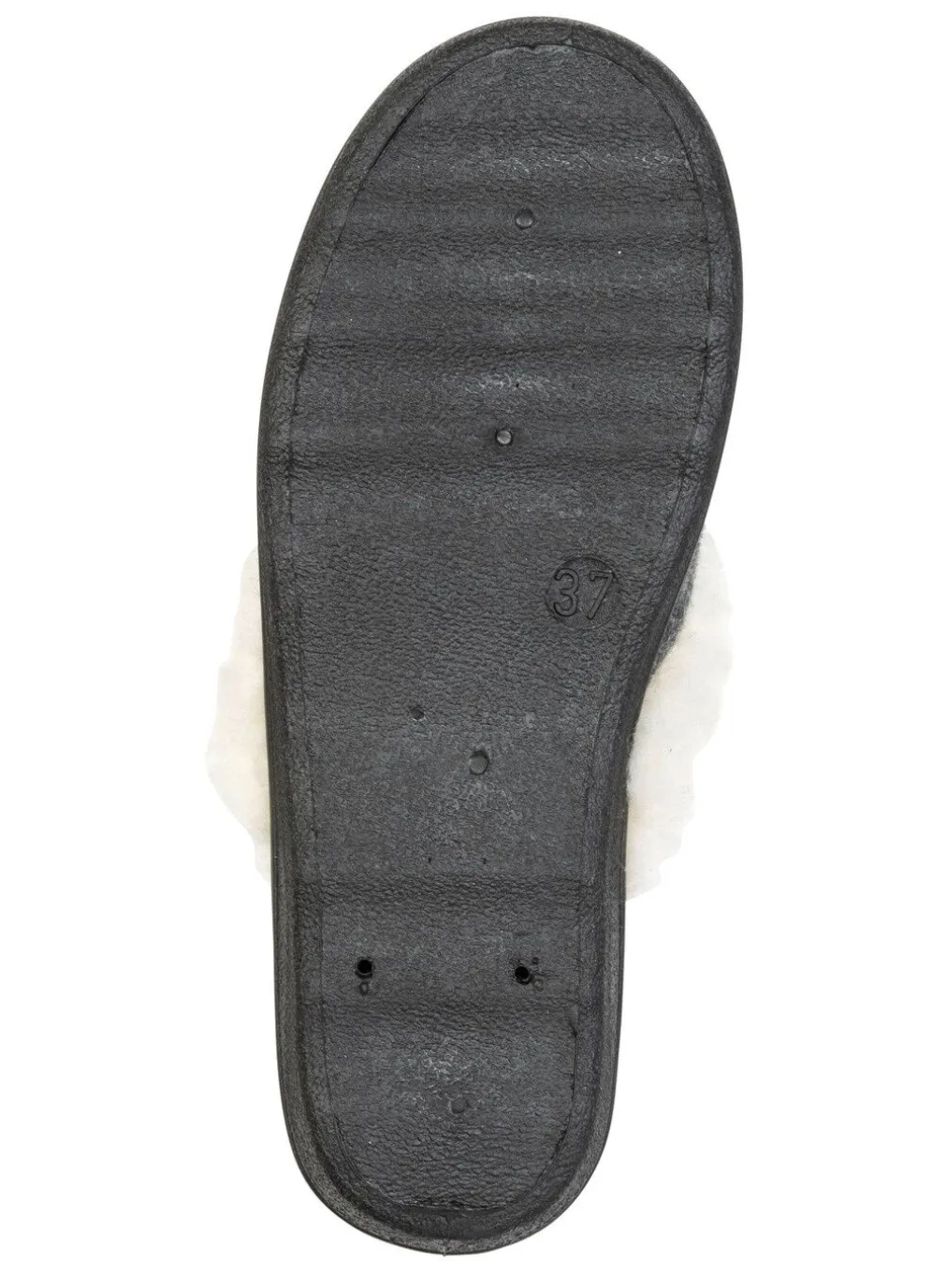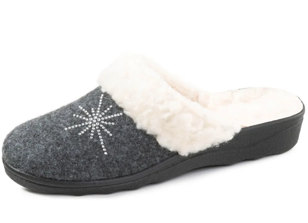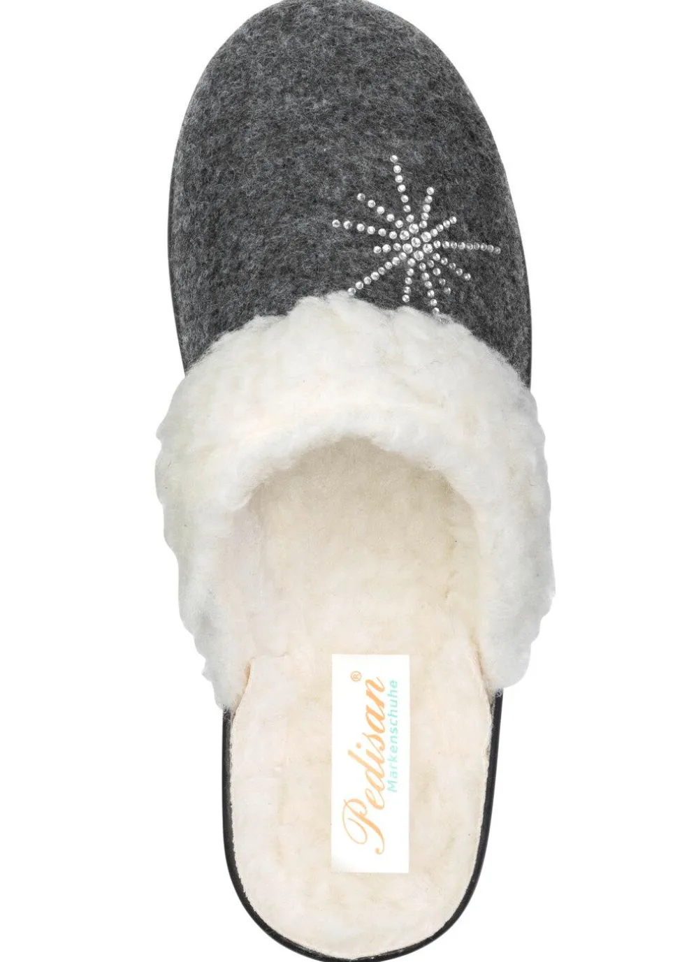 Hausschuhe in Anthrazit aus weichem Filz, mit funkelnden Glitzersteinchen besetzt: Plüschkragen sowie Warmfutter und Decksohlenbezug aus reiner Schurwolle, superleichte Synthetik-Laufsohle sowie 25 mm Keilabsatz