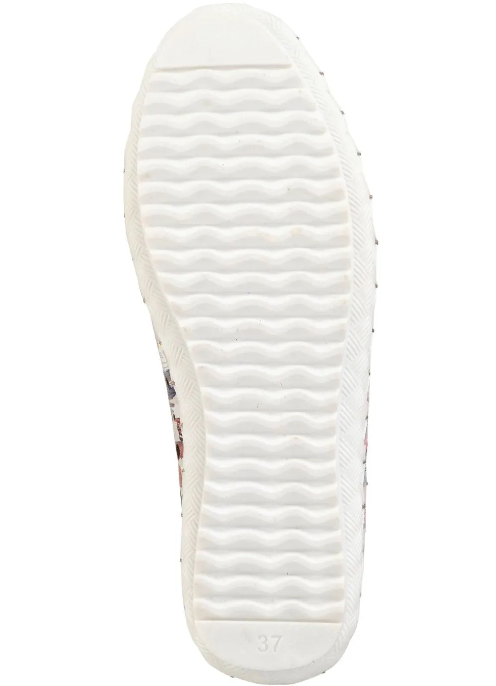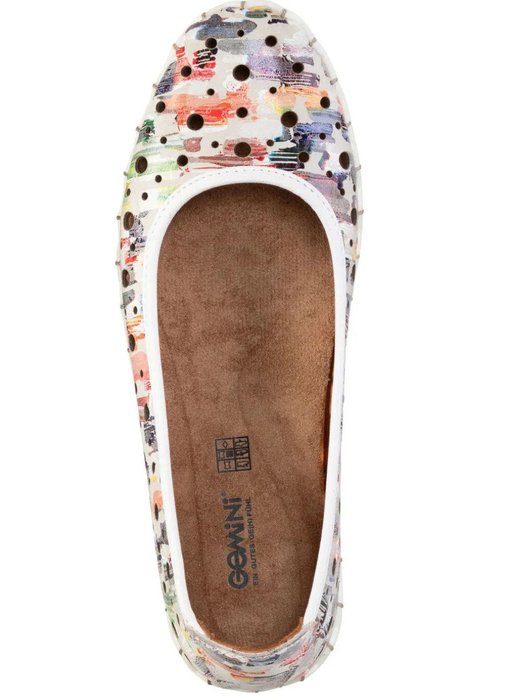 Ballerina aus bunt bedrucktem Nappaleder, mit luftigen Durchbrüchen: Weite G, Lederfutter, herausnehmbares Fußbett, leichte, handgenähte Synthetik-Profilsohle sowie 10 mm Keilabsatz