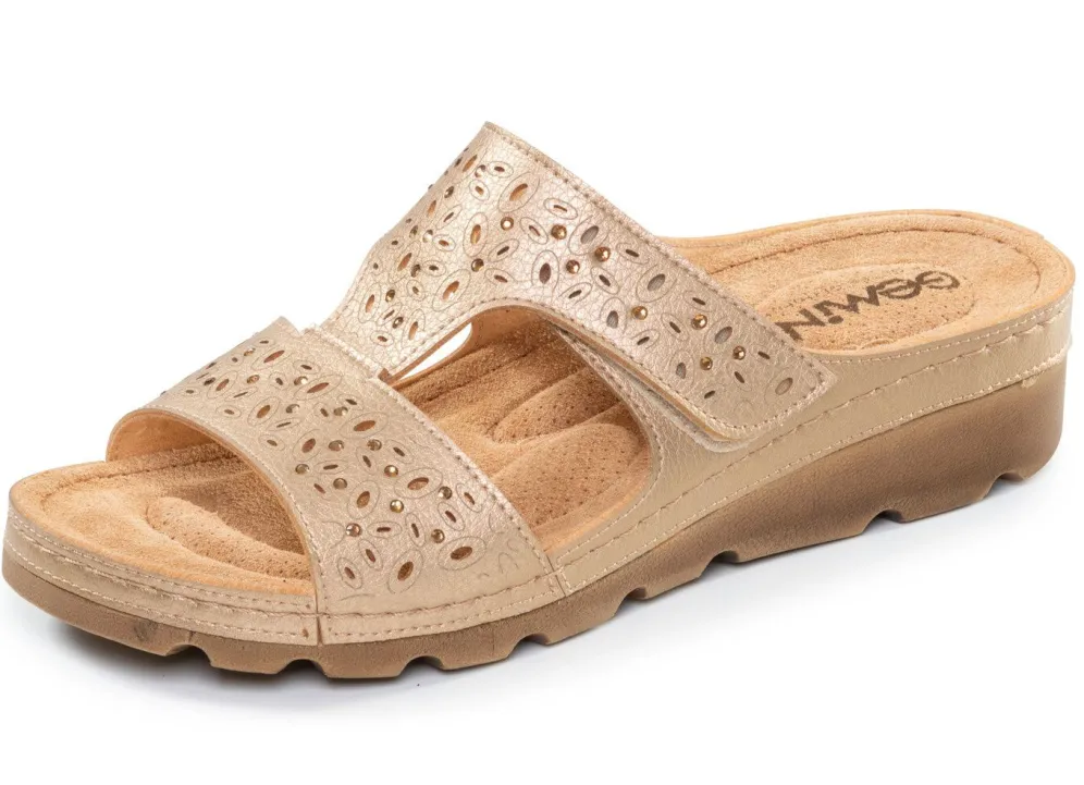Pantoletten aus geprägtem, perforiertem Synthetikmaterial, mit zart schimmernden Glitzersteinchen besetzt: Weite G, verstellbare Klettspange, Futter, gepolstertes Lederfußbett, leichte PU-Profilsohle sowie 25 mm Keilabsatz