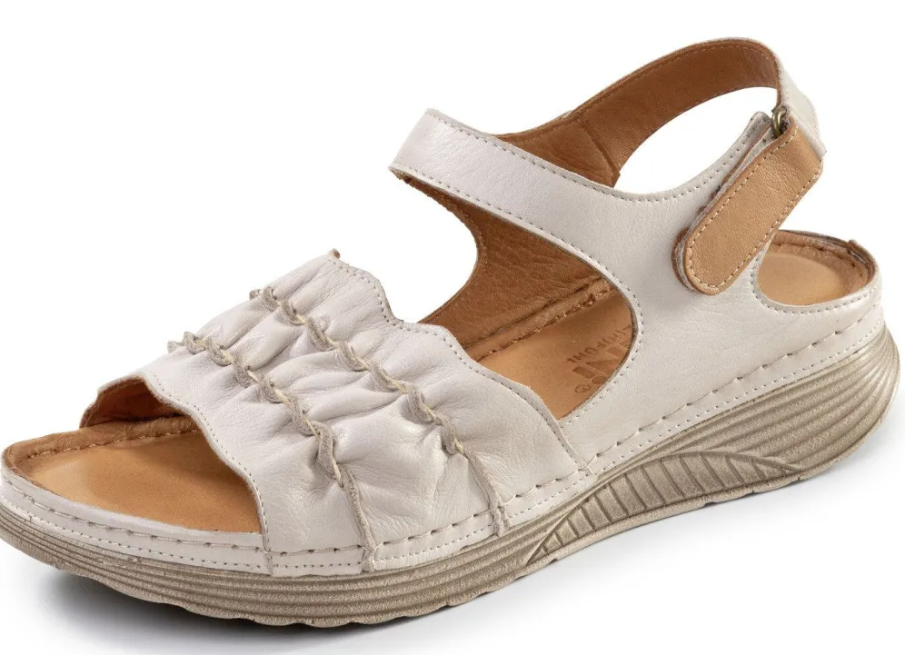 Sandalen aus weichem Rind-Nappaleder, mit Kordeldurchzügen, Raffung und cognacfarbener Fersen-Klettspange: Weite G, Lederfutter, gepolsterte Lederdecksohle sowie leichte PU-Laufsohle mit 20 mm Keilabsatz