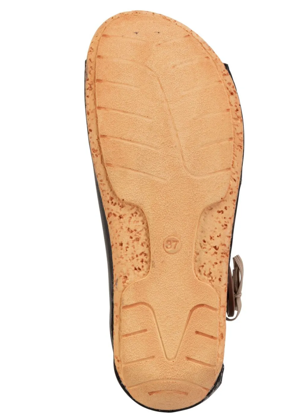 Sandale aus teils schattiertem Rind-Nappaleder: Weite G, seitliche Elastikschnürung mit Zierknopf, Lederfutter, gepolstertes Lederfußbett, superleichte PU-Laufsohle sowie 25 mm Keilabsatz