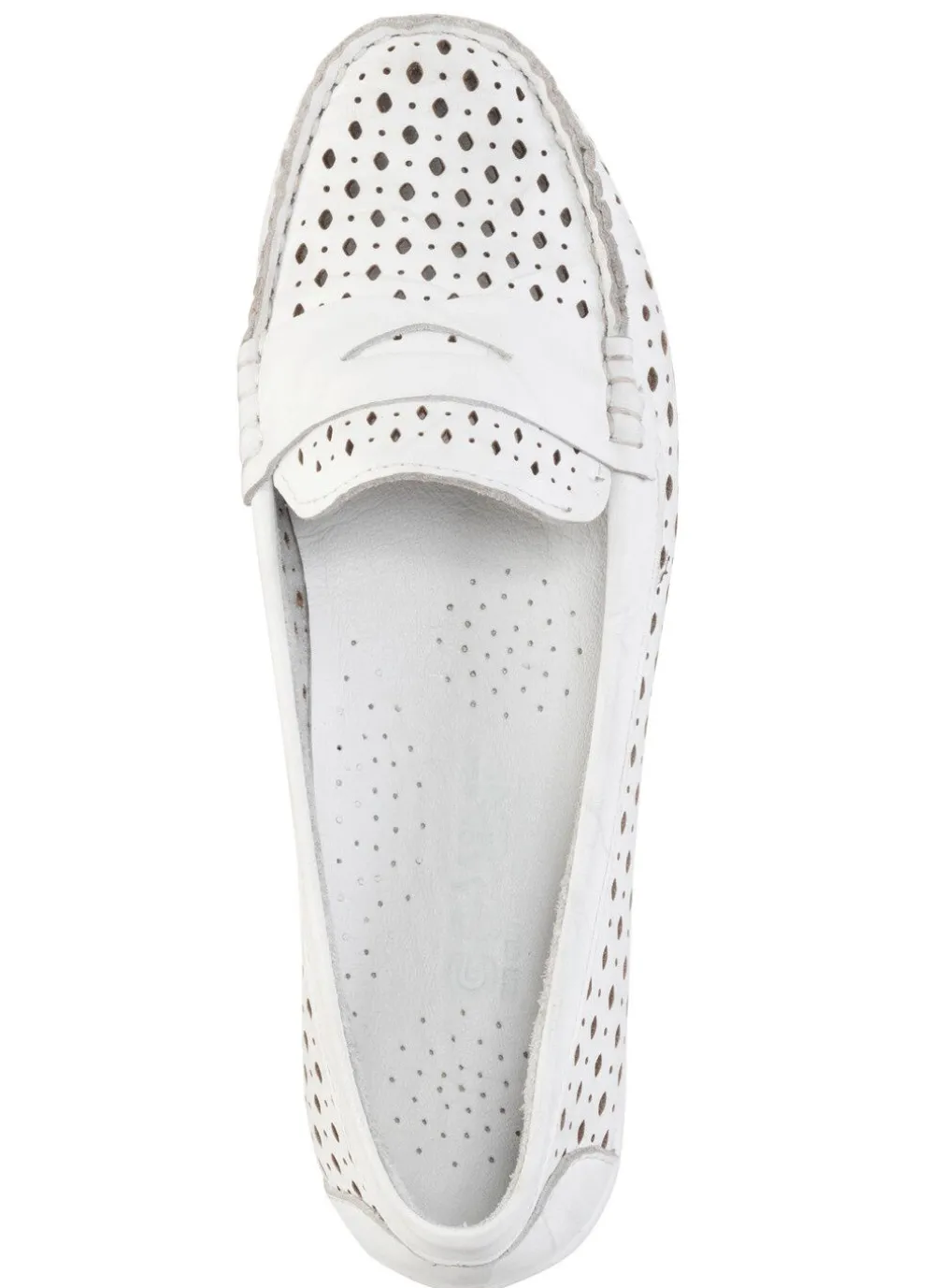 Luftig perforierter Mokassin-Slipper aus Nappaleder, teilweise mit Knitter-Struktur: Weite G, Lederspange, herausnehmbares Lederfußbett, leichte TR-Profilsohle sowie 10 mm Keilabsatz