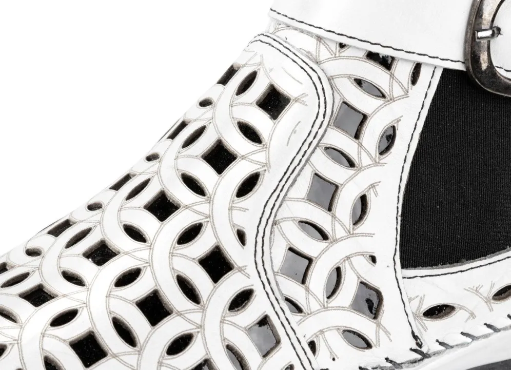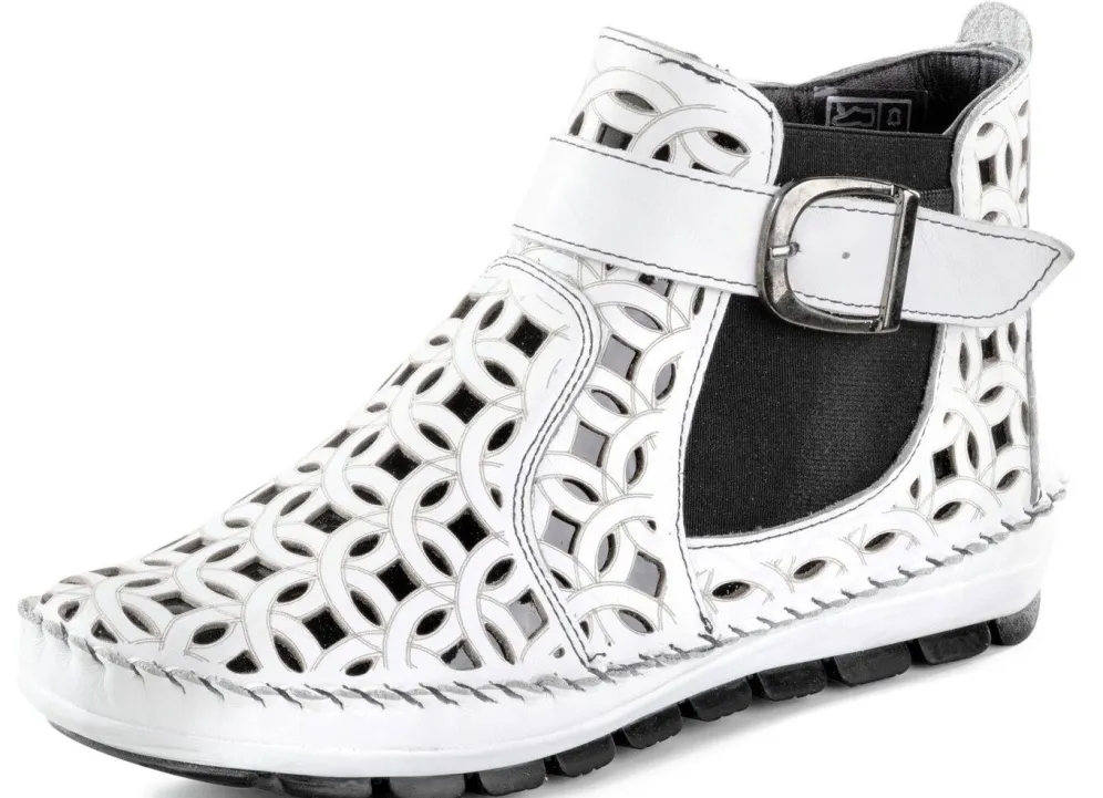 Boots in Mokassin-Machart, aus fantasievoll gelochtem Nappaleder, mit glänzendem Lackleder in Kontrastfarbe unterlegt: Weite G, seitlicher Elastikeinsatz, verstellbare Spange mit Gummizug, Innenreißverschluss, Textilfutter, herausnehmbares Lederfußbett, leichte TR-Profilsohle, 15 mm Keil. Schafthöhe ca. 10 cm