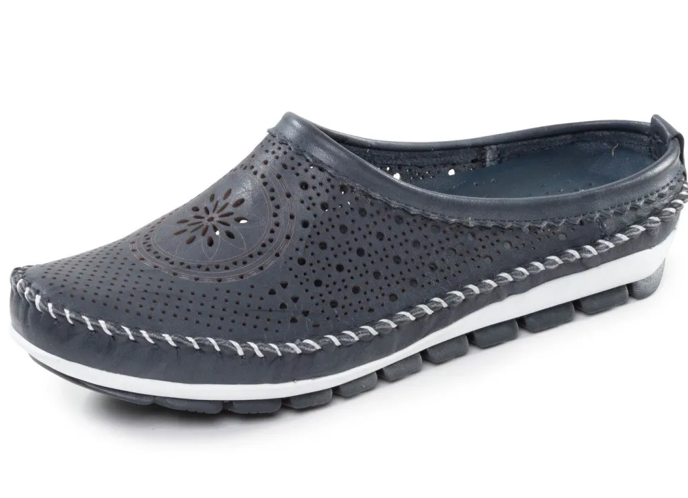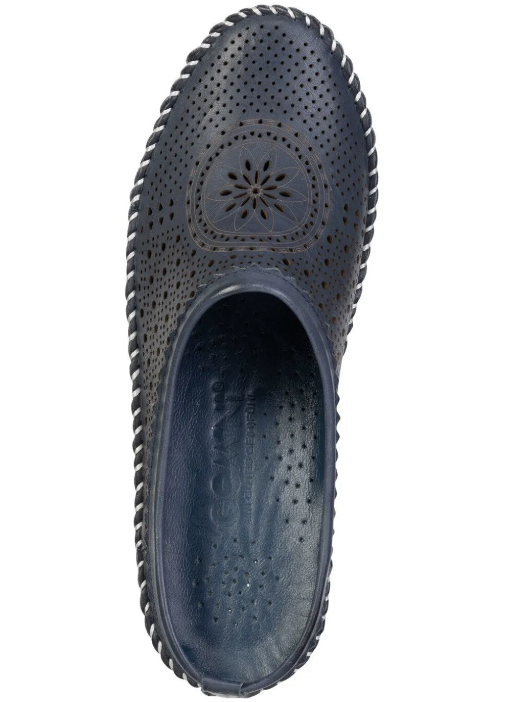 Sabot aus luftig perforiertem, geprägtem Nappaleder in Mokassin-Machart: Weite G, herausnehmbares Lederfußbett, leichte TR-Profilsohle sowie 15 mm Keilabsatz