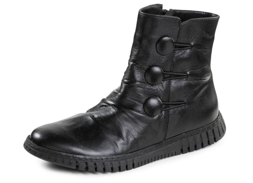 Stiefelette aus weichem Rind-Nappaleder, mit Raffung und dekorativen Knöpfen: Weite G, Innenreißverschluss, wärmendes Textilfutter, herausnehmbares Fußbett, leichte Gummilaufsohle, 10 mm Keilabsatz. Schafthöhe ca. 14 cm