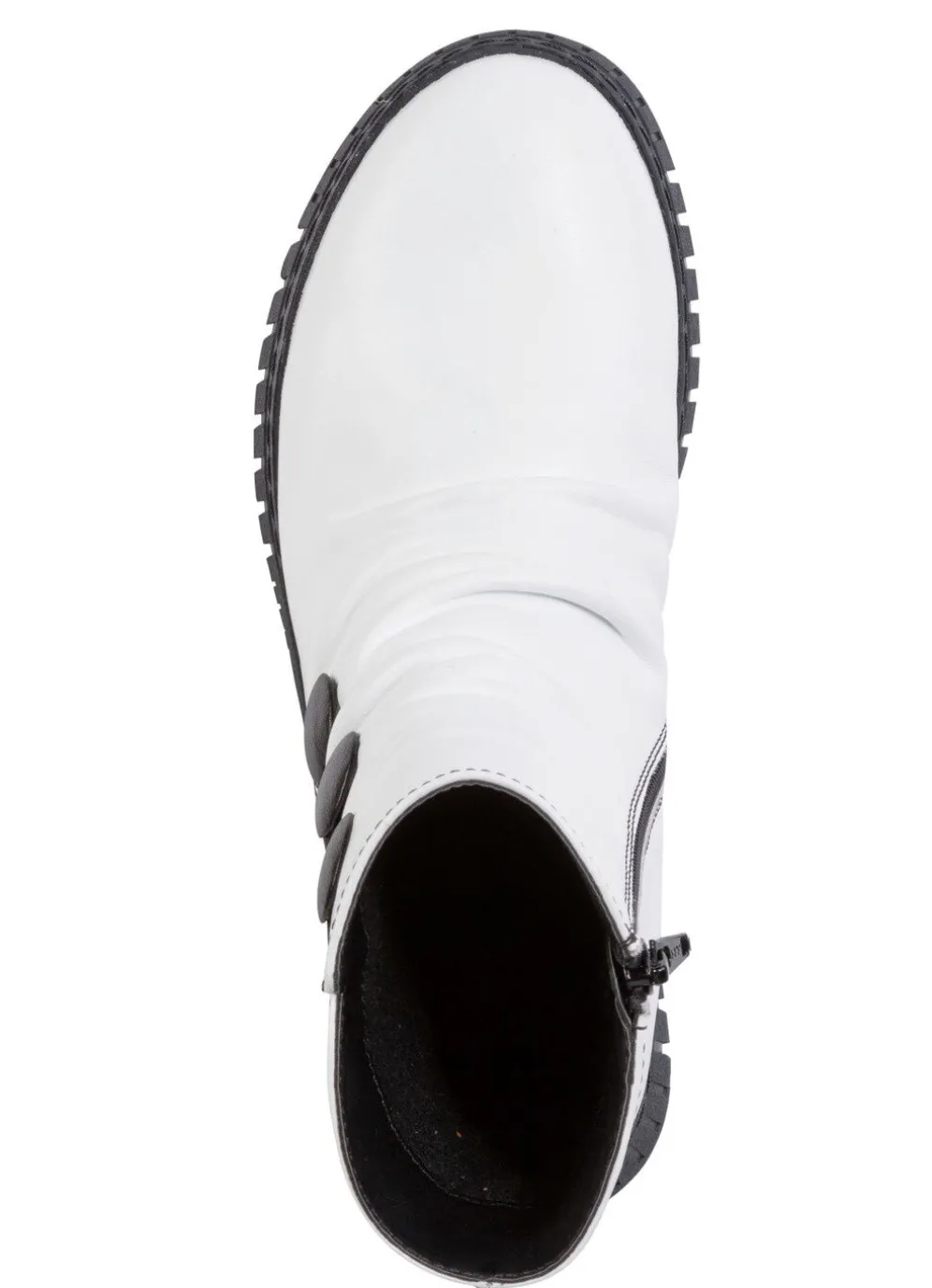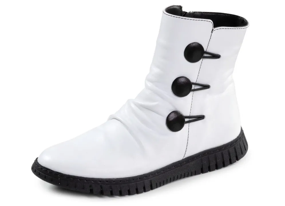 Stiefelette aus weichem Rind-Nappaleder, mit Raffung und dekorativen Knöpfen: Weite G, Innenreißverschluss, wärmendes Textilfutter, herausnehmbares Fußbett, leichte Gummilaufsohle, 10 mm Keilabsatz. Schafthöhe ca. 14 cm
