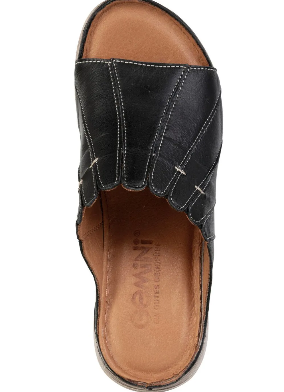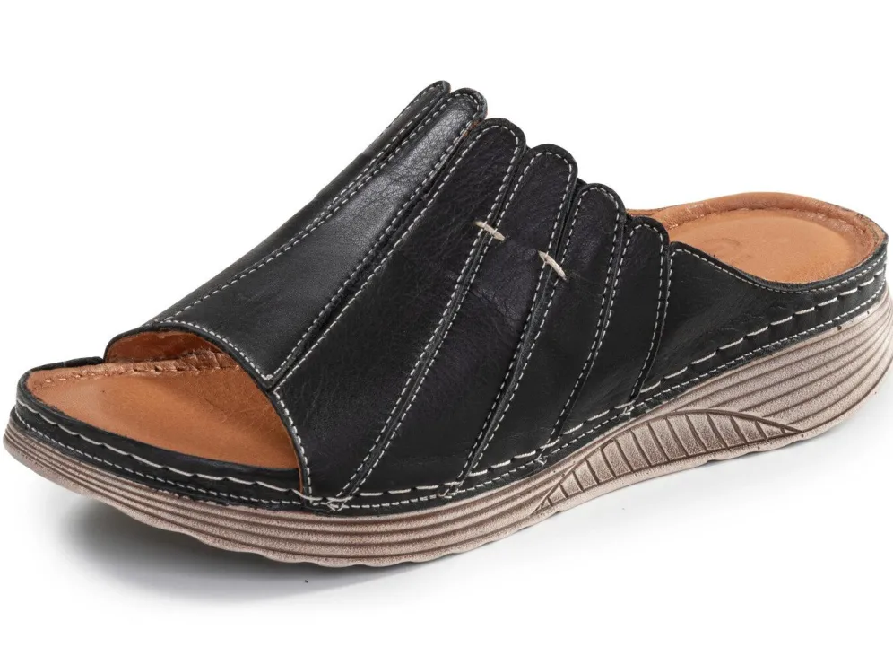 Interessante Pantoletten aus Nappaleder, mit verdeckten Elastikeinsätzen: Weite G, Lederfutter, gepolsterte Lederdecksohle sowie leichte PU-Laufsohle mit 20 mm Keilabsatz