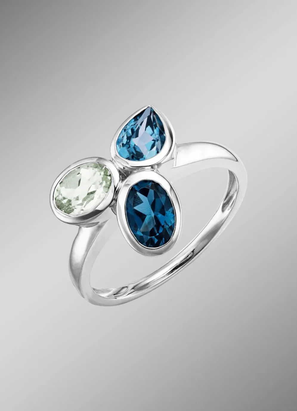 Harmonie der Farben: Damenring mit Blautopasen und grünem Amethyst