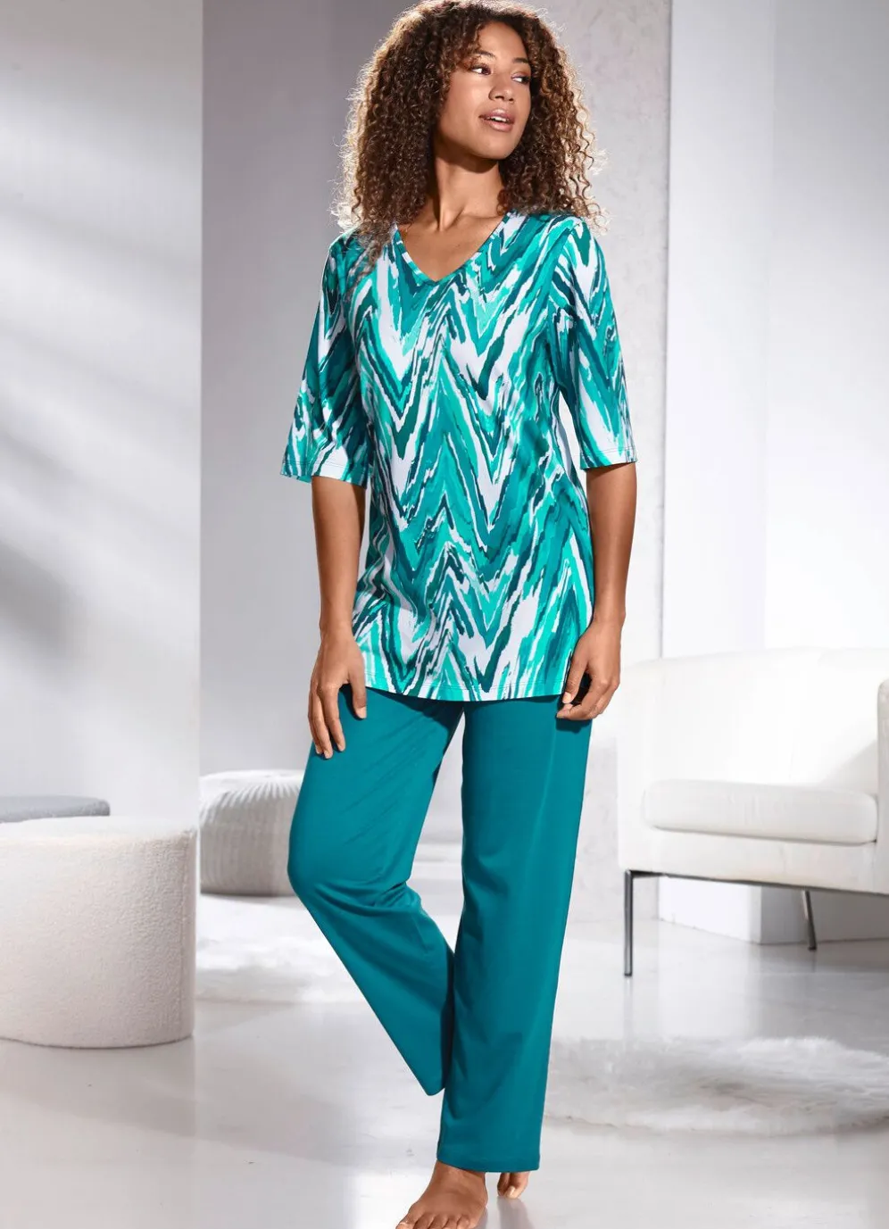 Hausanzug mit farbbrillantem Druck in Petrol-Mint-Ecru-Bunt. Oberteil mit V-Ausschnitt und zwei Seitenschlitzen.