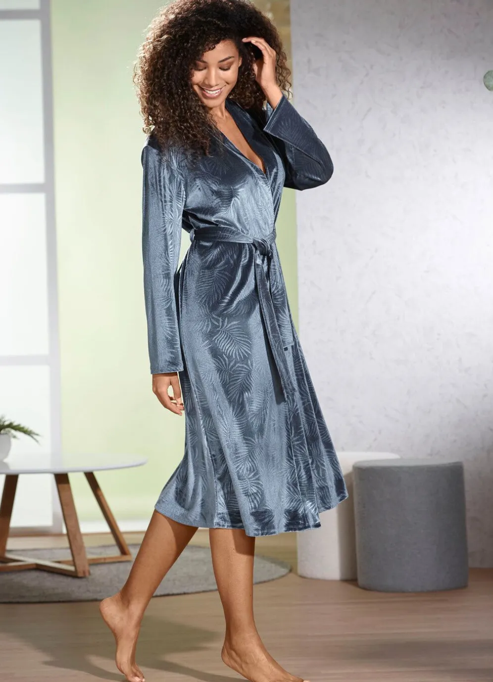Schickes und elegantes Design: wadenlanger, rauchblauer „Laurina”-Hausmantel in Kimono-Form mit Gürtelschlaufen und Bindegürtel sowie innerer Bindemöglichkeit.