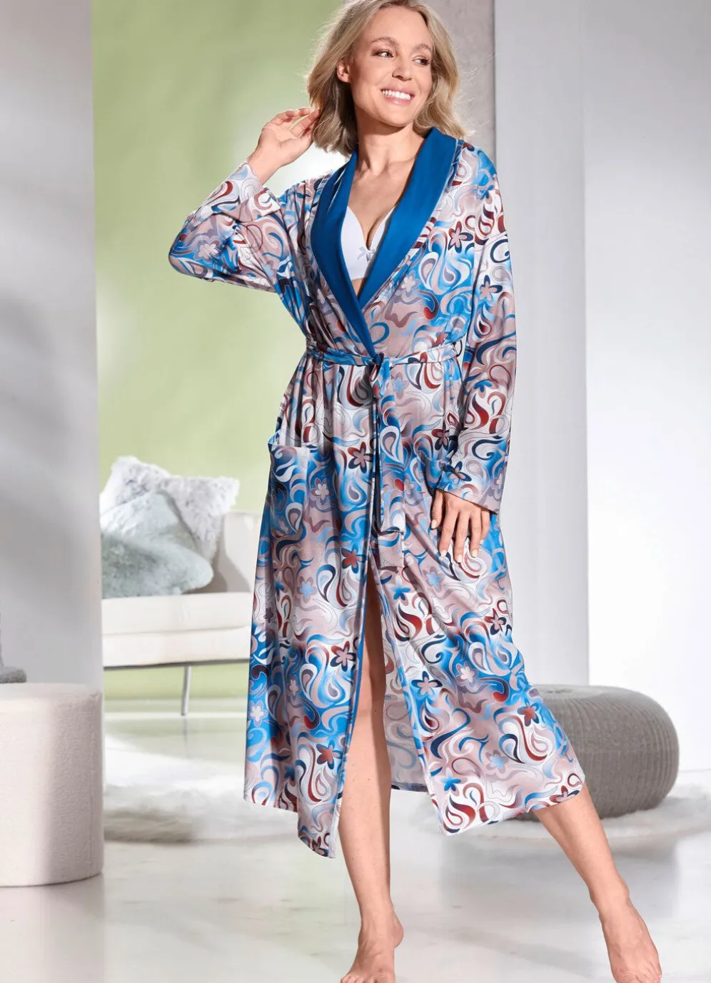 Leichter, wadenlanger Hausmantel mit modischem Allover-Dessin in Blau-Taupe-Ecru-Bunt: Schalkragen mit farblichem Einsatz, zwei aufgesetzte Taschen, Gürtelschlaufen und Bindegürtel sowie innerer Bindemöglichkeit.