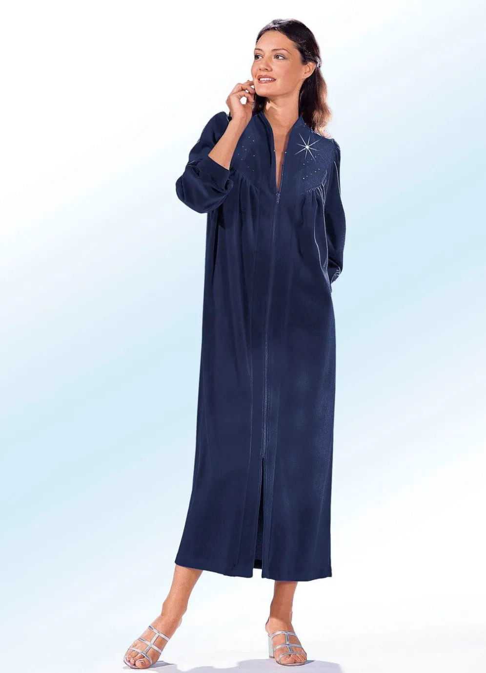 Ideal für kühlere Tage eignet sich dieser knöchellange Hausmantel mit Kelchkragen, durchgehendem Reißverschluss, strassverzierter, abgesteppter Vorderpasse, Raffung vorne, am Ansatz der langen Raglanärmel mit Bündchenabschlüssen und an der Rückenpasse, Seitennahttasche sowie innerem Rückensattel.