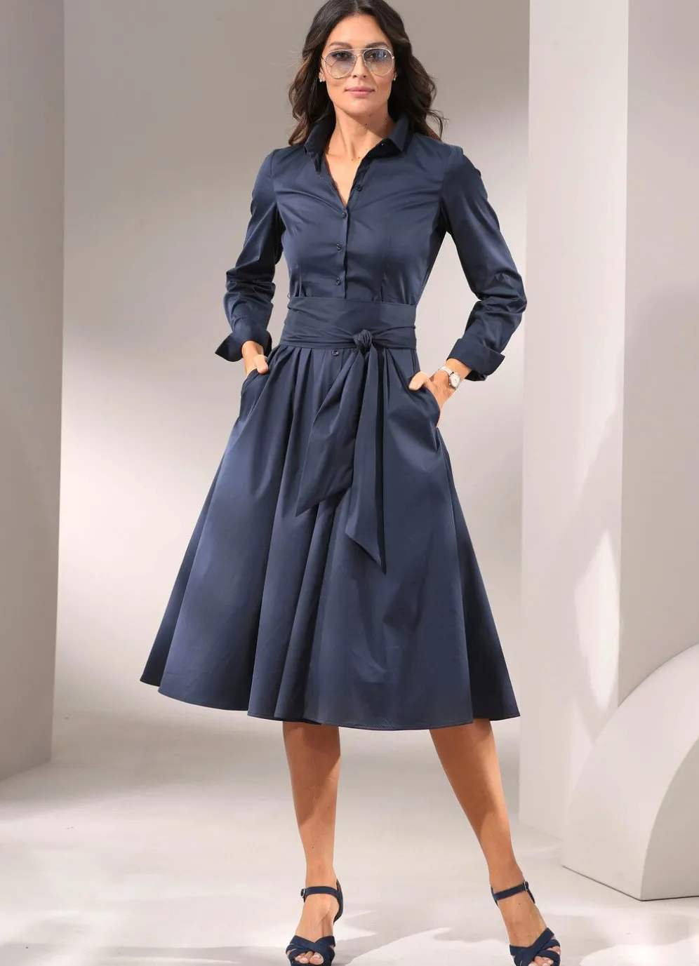 Feminines Hemdblusenkleid von TIZIA in durchgeknöpfter Form, mit breitem Bindegürtel, Kentkragen, langen Ärmeln mit aparten Manschetten, Seitennahttaschen sowie angesetztem, schwingendem, weiten Rockteil.