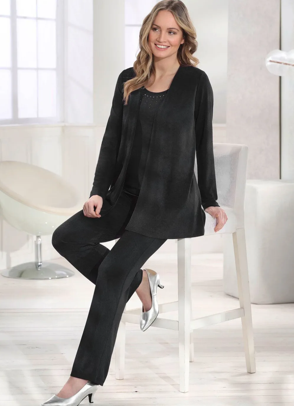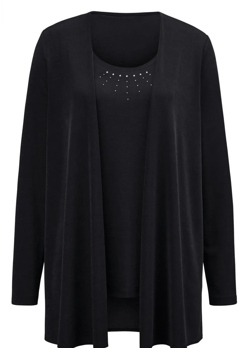 Hinreißendes, 2-teiliges Twin-Set! Bestehend aus einer Shirtjacke in legerer verschlussloser Form, Länge ca. 78 cm ab Gr. 46 ca. 81 cm sowie unifarbenes Trägershirt mit edler Strasszier im Vorderteil, Länge ca. 68 cm, ab Gr. 46 ca. 71 cm.