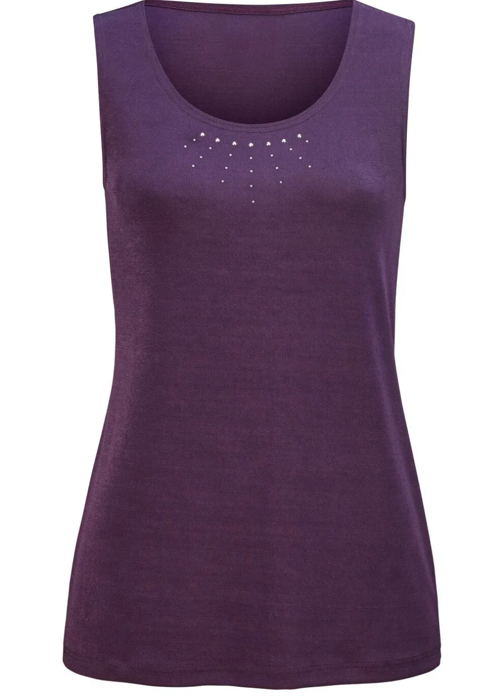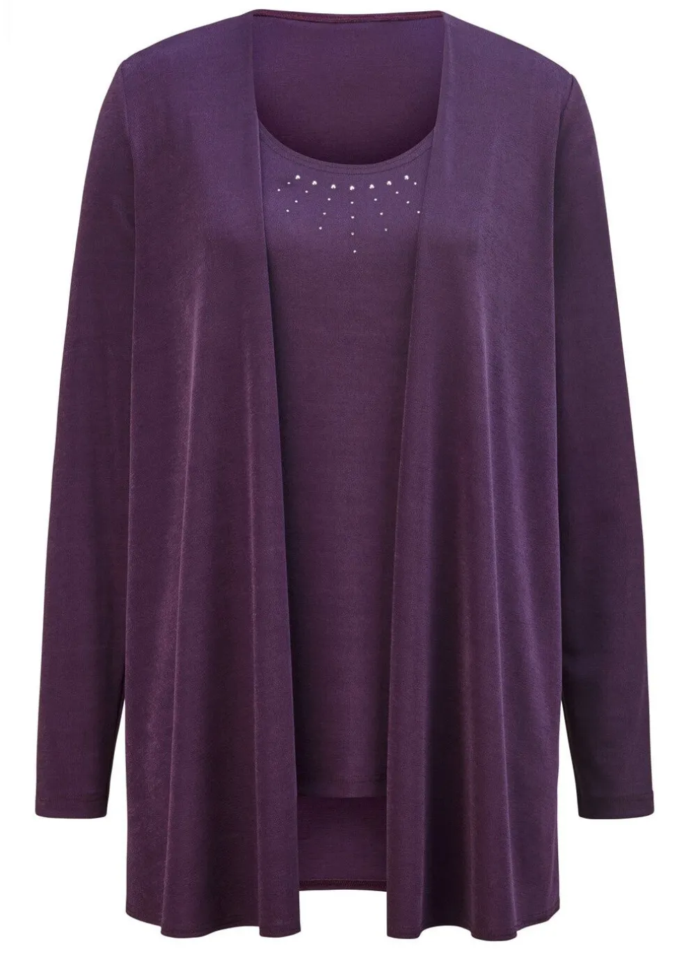 Hinreißendes, 2-teiliges Twin-Set! Bestehend aus einer Shirtjacke in legerer verschlussloser Form, Länge ca. 78 cm ab Gr. 46 ca. 81 cm sowie unifarbenes Trägershirt mit edler Strasszier im Vorderteil, Länge ca. 68 cm, ab Gr. 46 ca. 71 cm.