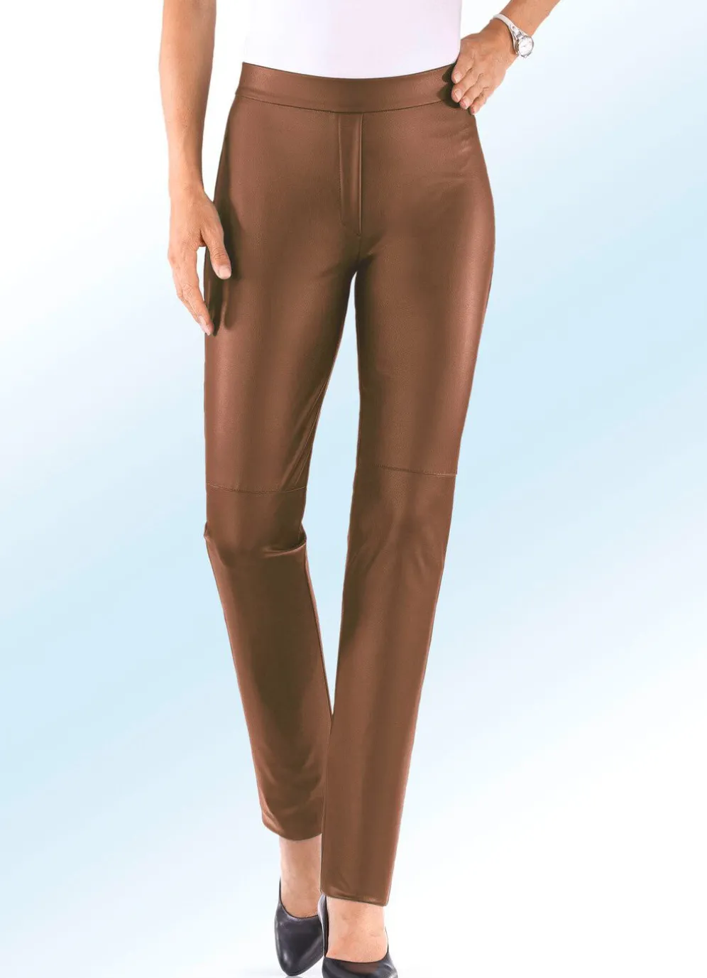Ihr Modell BECKY – voll im Trend ist diese tragangenehme Hose aus softem Nappaleder-Imitat, in bequemer Schlupfform, glatt anliegend dank des innenliegenden, unsichtbaren Rundum-Dehnbundes, vordere Reißverschluss-Zierblende sowie Teilungsnähte im Kniebereich. Innenbeinlänge ca. 79 cm, Fußweite ab 34 cm.