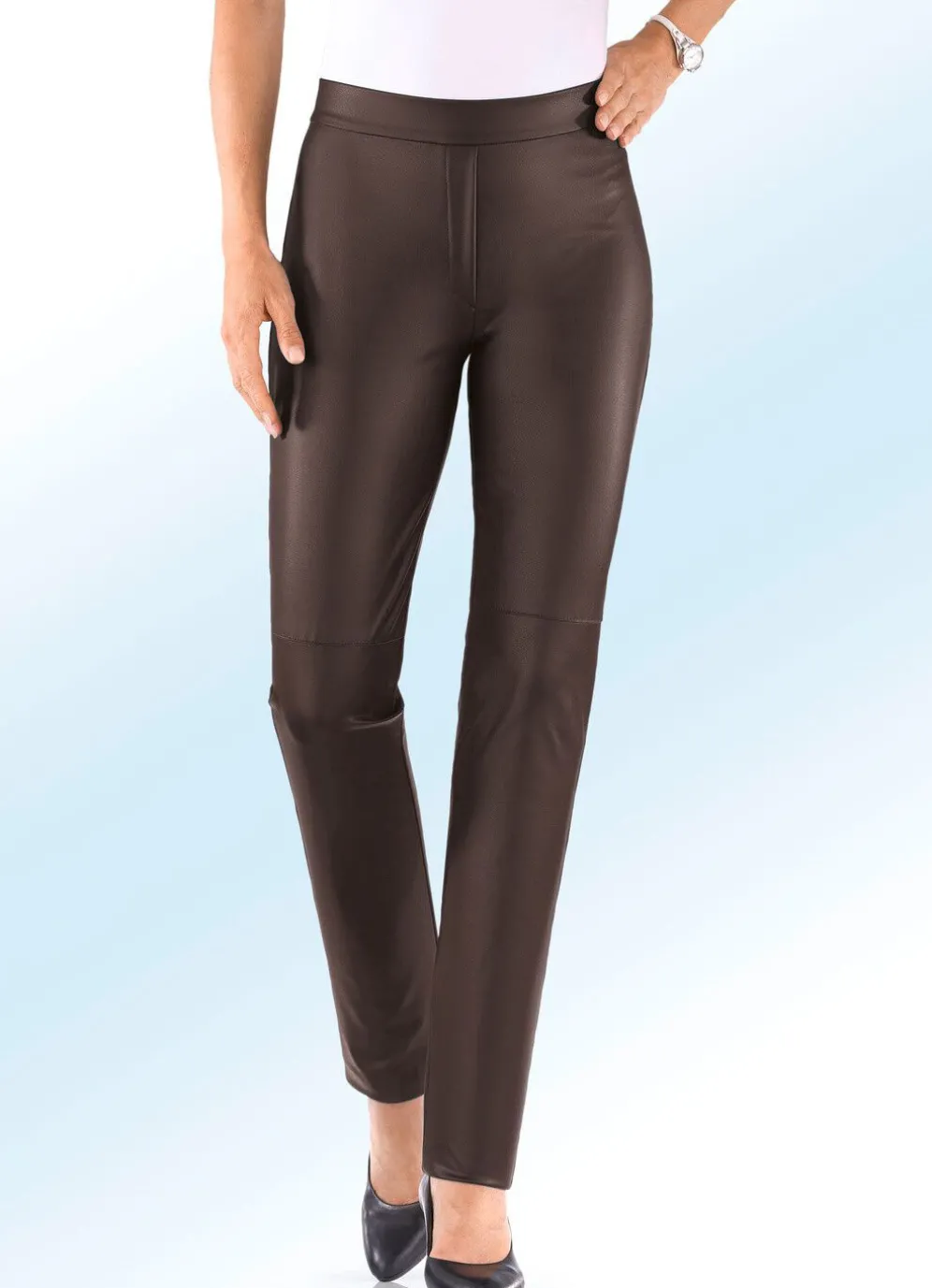 Ihr Modell BECKY – voll im Trend ist diese tragangenehme Hose aus softem Nappaleder-Imitat, in bequemer Schlupfform, glatt anliegend dank des innenliegenden, unsichtbaren Rundum-Dehnbundes, vordere Reißverschluss-Zierblende sowie Teilungsnähte im Kniebereich. Innenbeinlänge ca. 79 cm, Fußweite ab 34 cm.