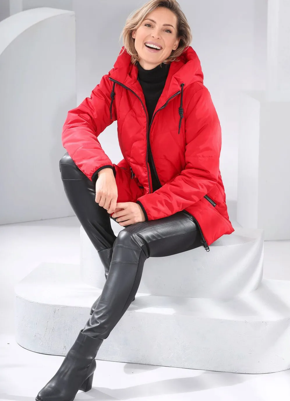 Extravagant gestylte, schwarze Hose im interessanten Materialmix: vorne aus angesagtem Nappaleder-Imitat mit interessanten Absteppungen und Teilungsnähten, rückseitig aus elastischem Glanz-Jersey, in Schlupfform, glatt anliegend dank den innenliegenden Rundum-Dehnbundes. Innenbeinlänge ca. 77 cm, Fußweite ab