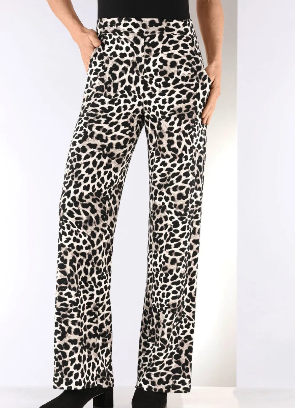Angesagte Hose mit modisch weitem Beinverlauf in aktueller Leo-Dessinierung: komfortable Schlupfform, glatt anliegend dank des innenliegenden, unsichtbaren Rundum-Dehnbundes sowie Seitentaschen. Innenbeinlänge ca. 80 cm, Fußweite ab 52 cm.