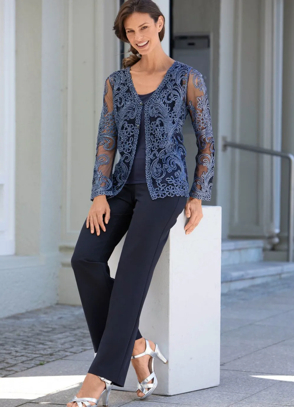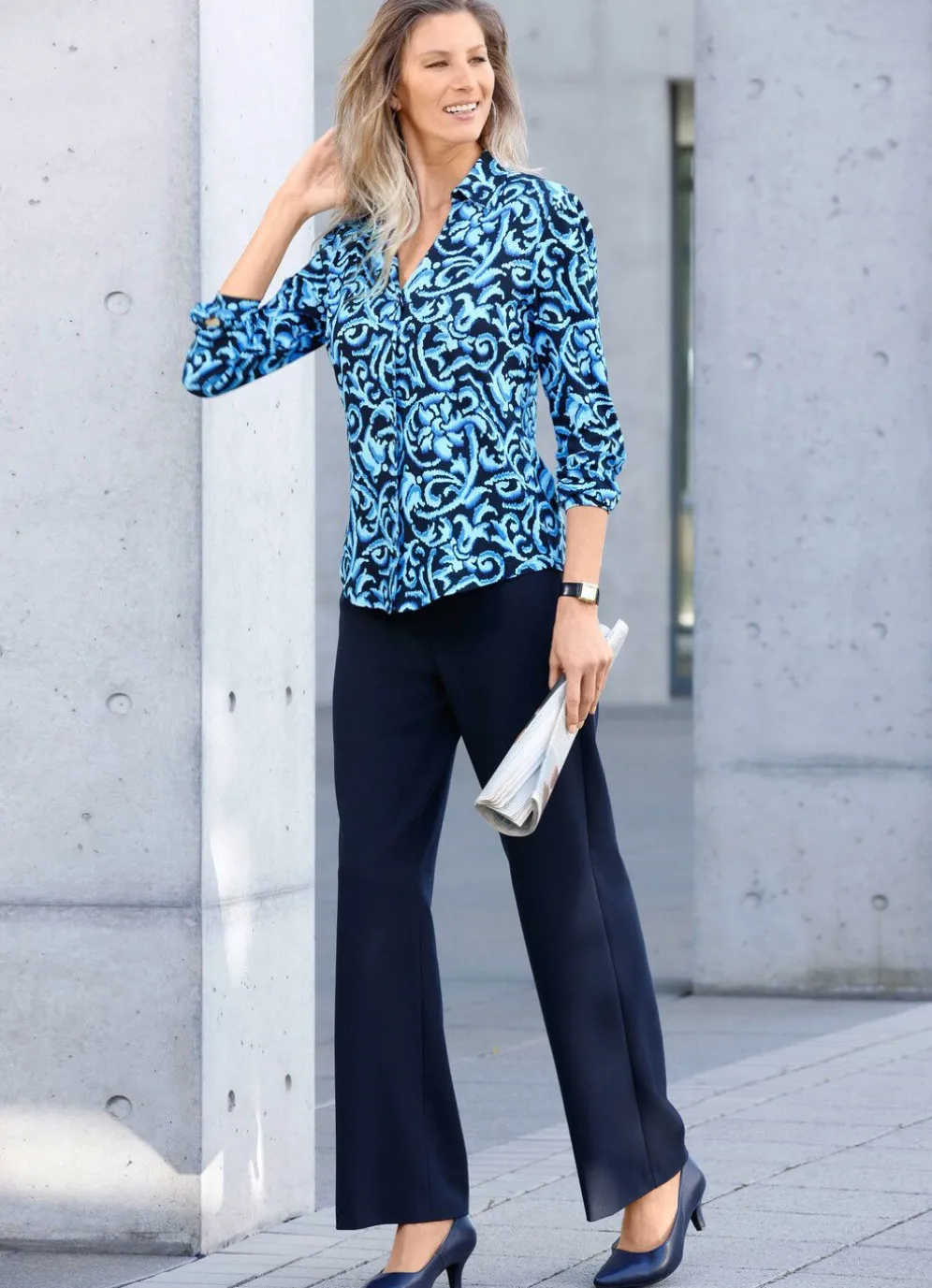 Attraktive Hose in Palazzo-Form: weites Bein, bequeme Schlupfform, Dehnbund rundum sowie Gürtelschlaufen. Innenbeinlänge ca. 78 cm, Fußweite ab 52 cm.