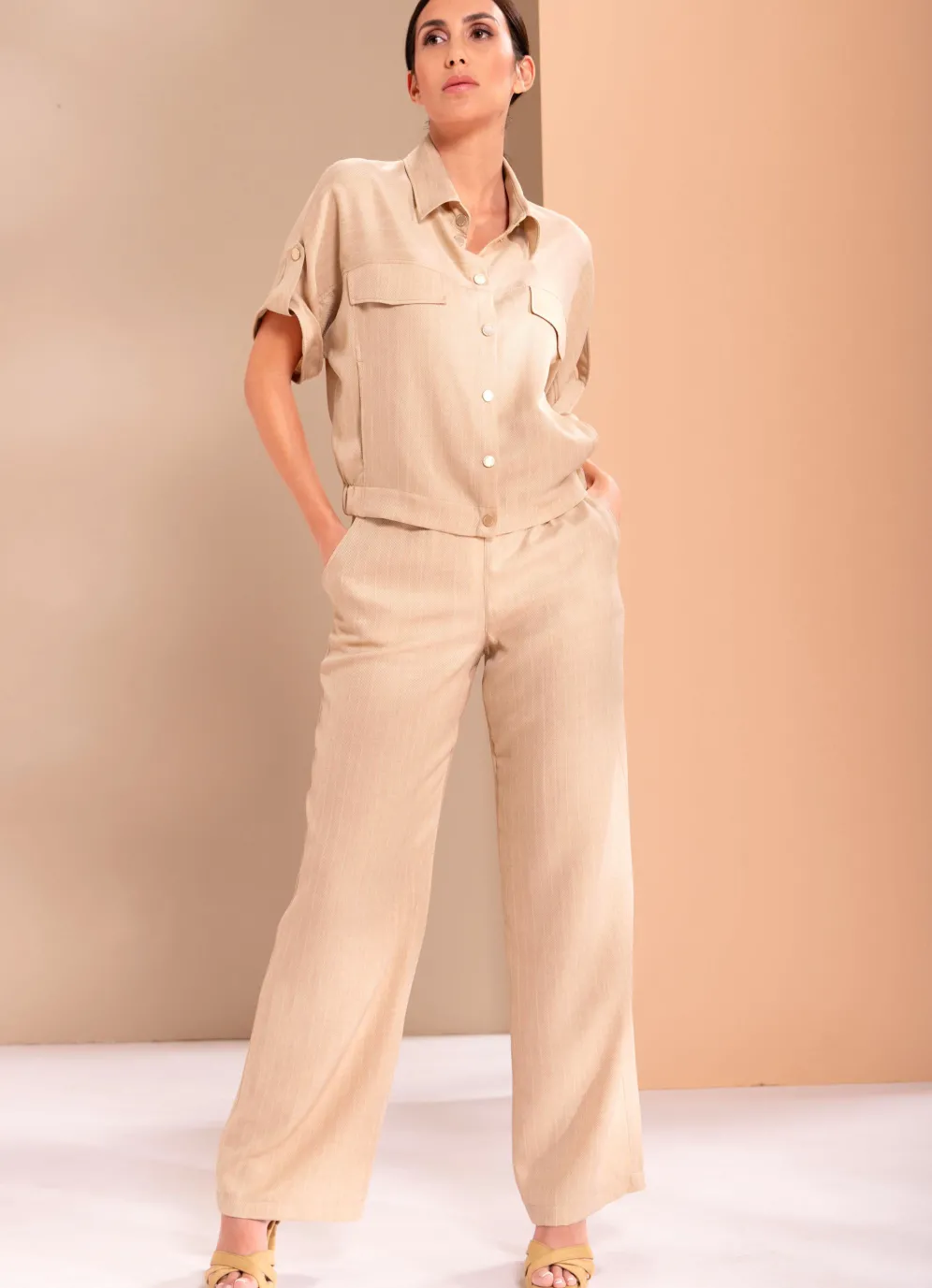 Taupefarbene Hose von B/ANCA in langer, ausgestellter Form: Dehnbund rundum mit Bindeband sowie zwei Seitentaschen.