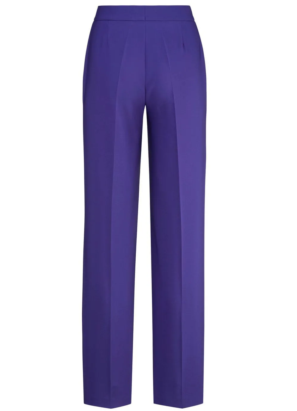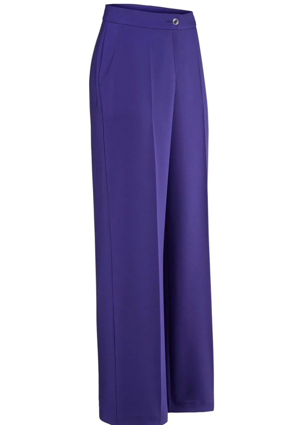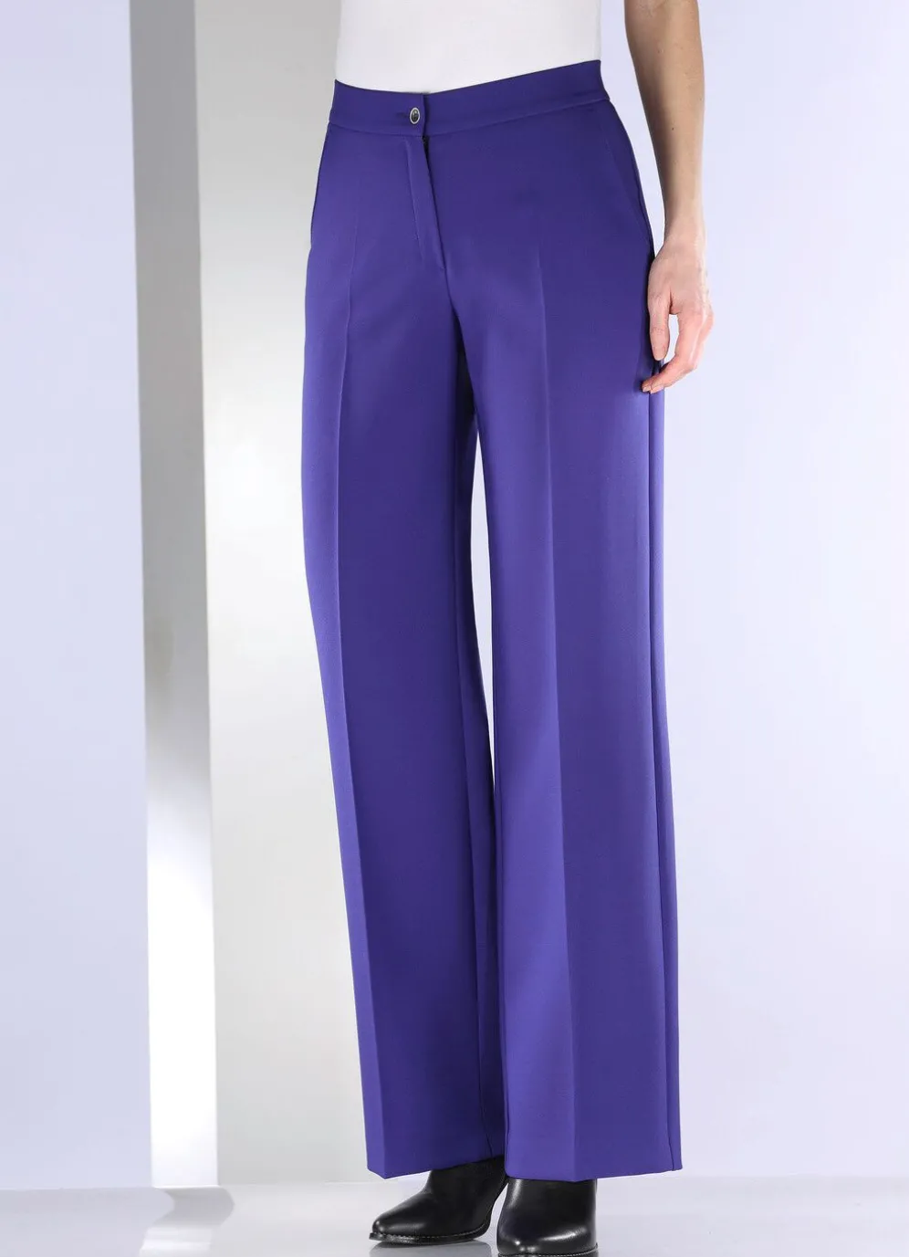 Bequeme, weite Hose mit angesetztem Bund, Knopf- und Reißverschluss, Seitentaschen sowie figurformende Abnäher im Rückteil. Innenbeinlänge ca. 80 cm, Fußweite ab 56 cm.