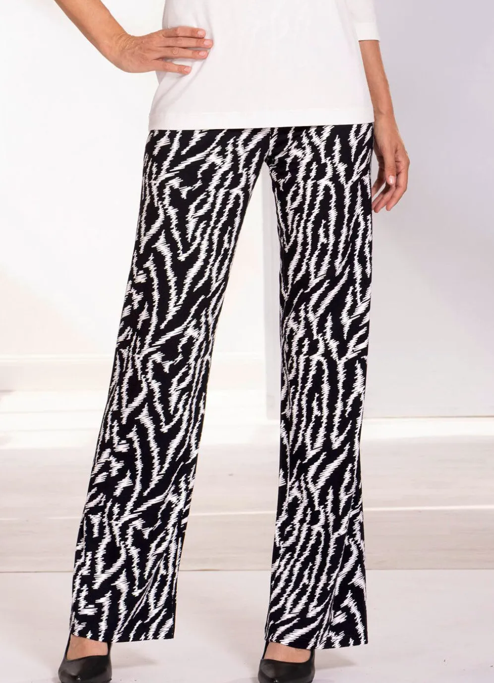 Jedes Teil ein Unikat! In ausdrucksstarker Dessinierung präsentiert sich diese weich fließende Hose in Schwarz-Ecru: bequeme Weite und in komfortabler Schlupfform mit Dehnbund rundum. Innenbeinlänge ca. 78 cm. Fußweite ab 52 cm.