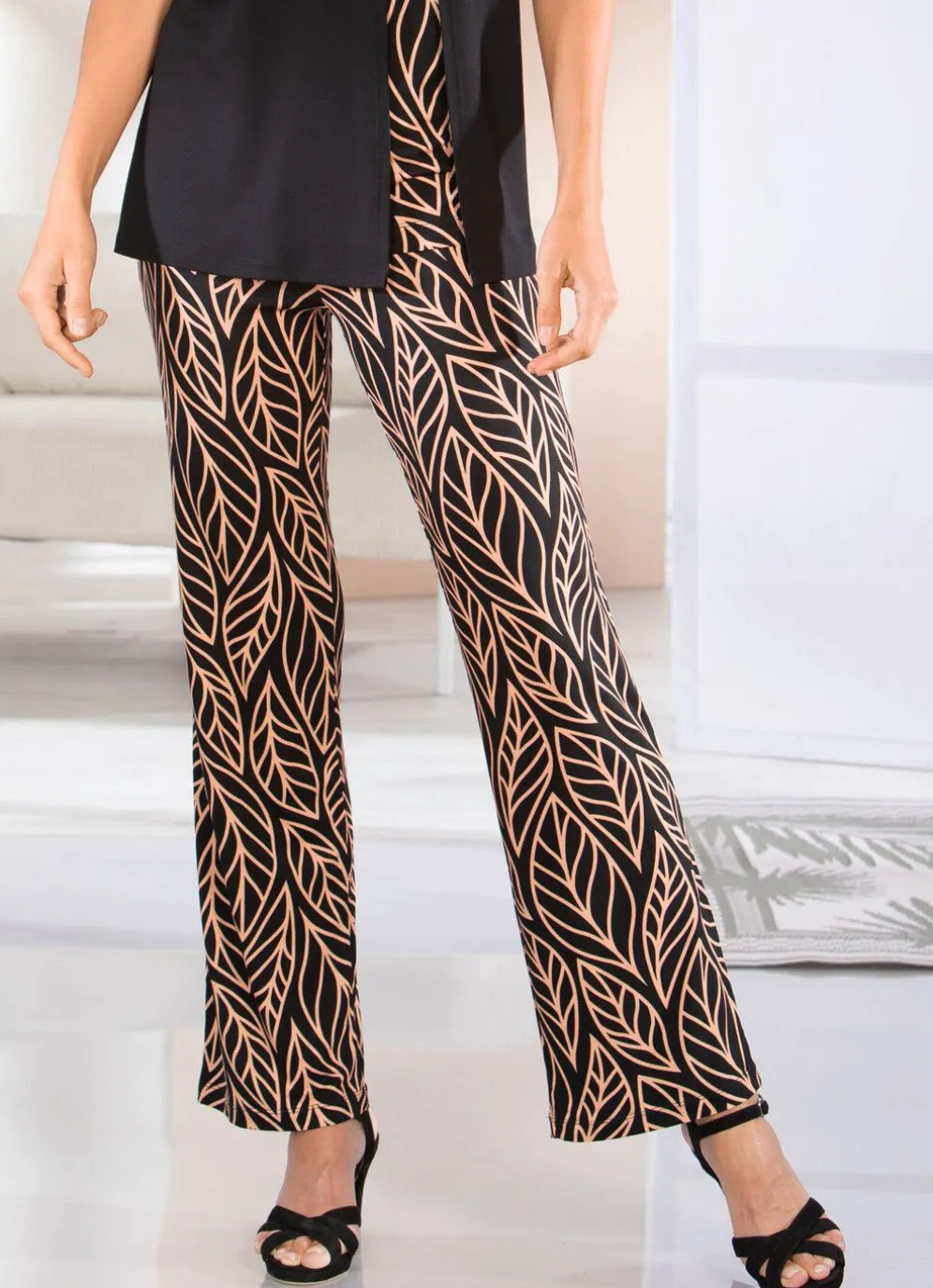 Jedes Teil ein Unikat! In ausdrucksstarker Dessinierung präsentiert sich diese weich fließende Hose in Schwarz-Camel: bequeme Weite und in komfortabler Schlupfform mit Dehnbund rundum. Innenbeinlänge ca. 79 cm. Fußweite ab 48 cm.