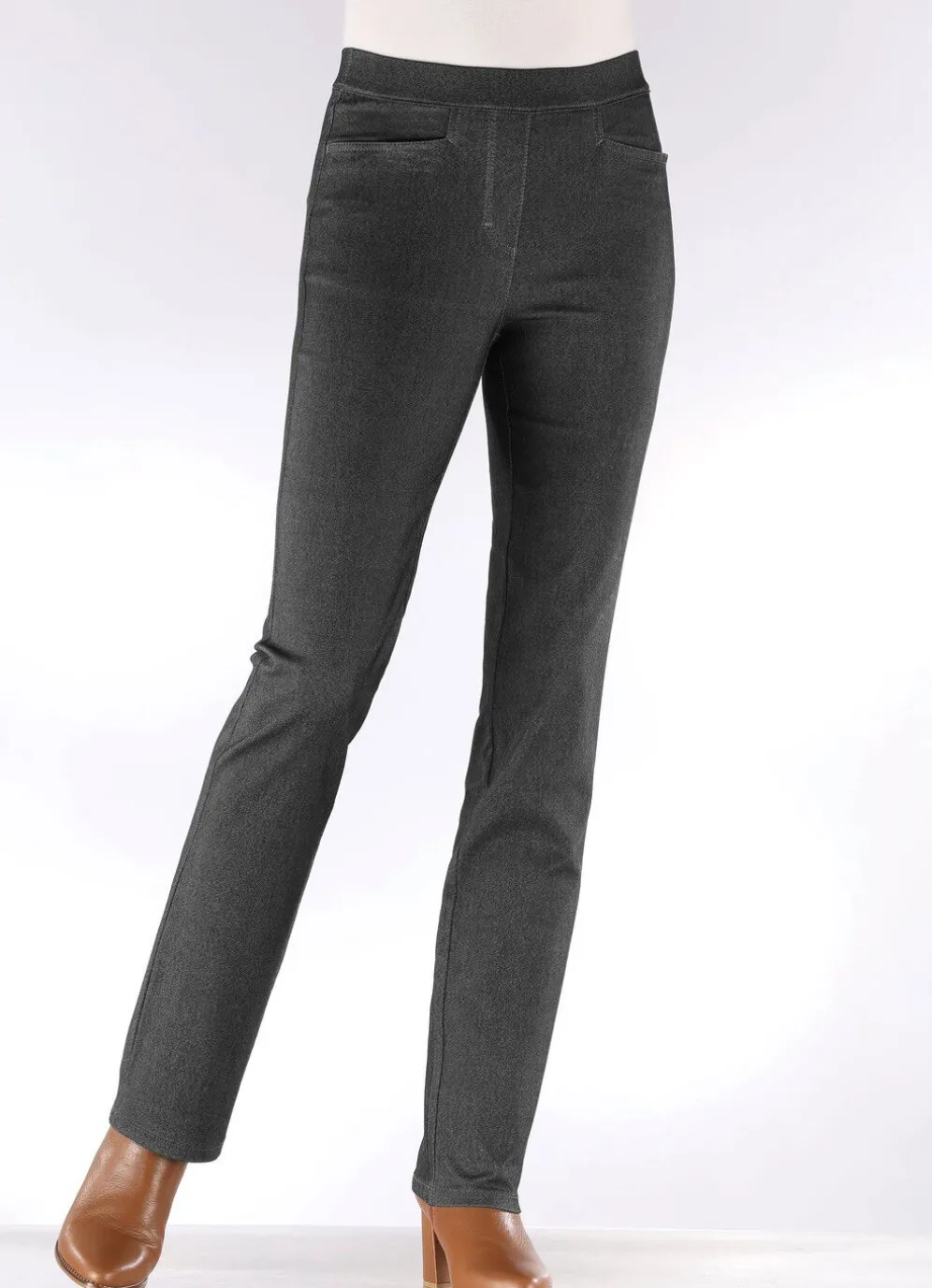 Komfortable Hose in Denim-Optik und bequemer Schlupfform: glatt anliegend dank der innenliegenden, unsichtbaren Gummibund-Einlage, angedeutete Reißverschluss-Zierblende, Seitentaschen, angedeutete Gesäßtaschen mit schönen Ziersteppungen. Innenbeinlänge ca. 78 cm, Fußweite ab 38 cm.