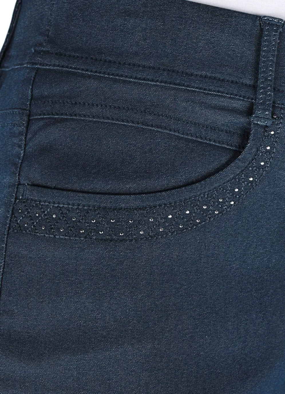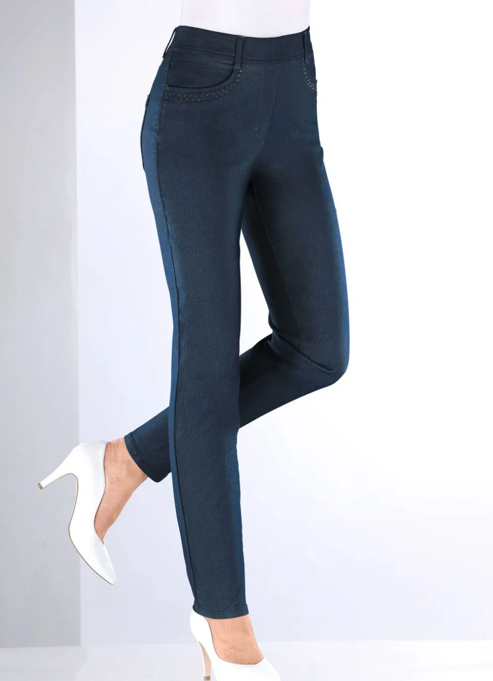 Ein abolutes Highlight ist diese komfortable Hose in Denim-Optik und bequemer Schlupfform: glatt anliegend dank der innenliegenden, unsichtbaren Gummibund-Einlage, Gürtelschlaufen, angedeutete Reißverschluss-Zierblende, Seitentaschen mit schönen Absteppungen und Glitzersteinchenbesatz, aufgesetzte Gesäßtaschen sowie figurformende Passe im Rückteil. Innenbeinlänge ca. 78 cm, Fußweite ab 29 cm.