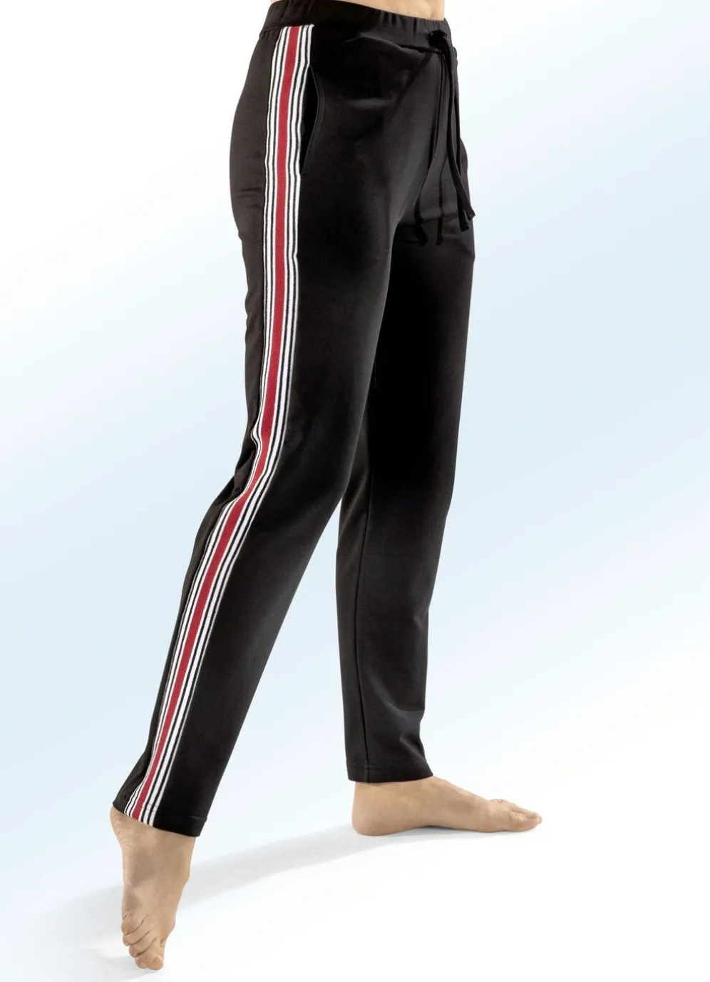 Schwarze PLANTIER-Hose in langer Form mit Tunnelzugband, angesagten, rot-weißen, kontrastfarbenen Einsätzen an der Seitennaht sowie zwei Seitennahttaschen.