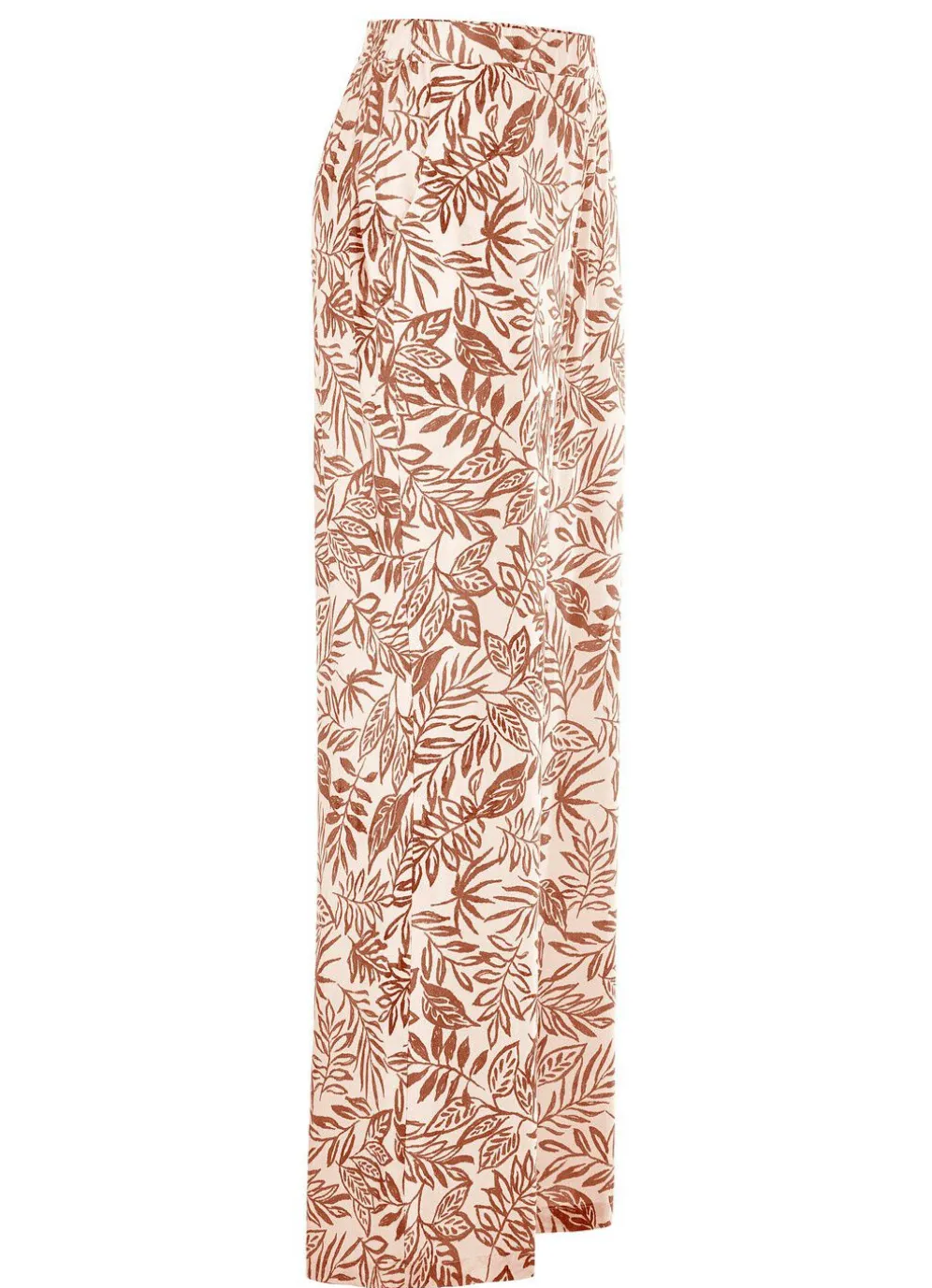 Floral dessinierte Hose in modischer Weite: komfortable Schlupfform, rückwärtiger Dehnbundeinsatz, vordere, glatte Bundverarbeitung sowie Seitentaschen. Innenbeinlänge ca. 78 cm, Fußweite ab 52 cm.