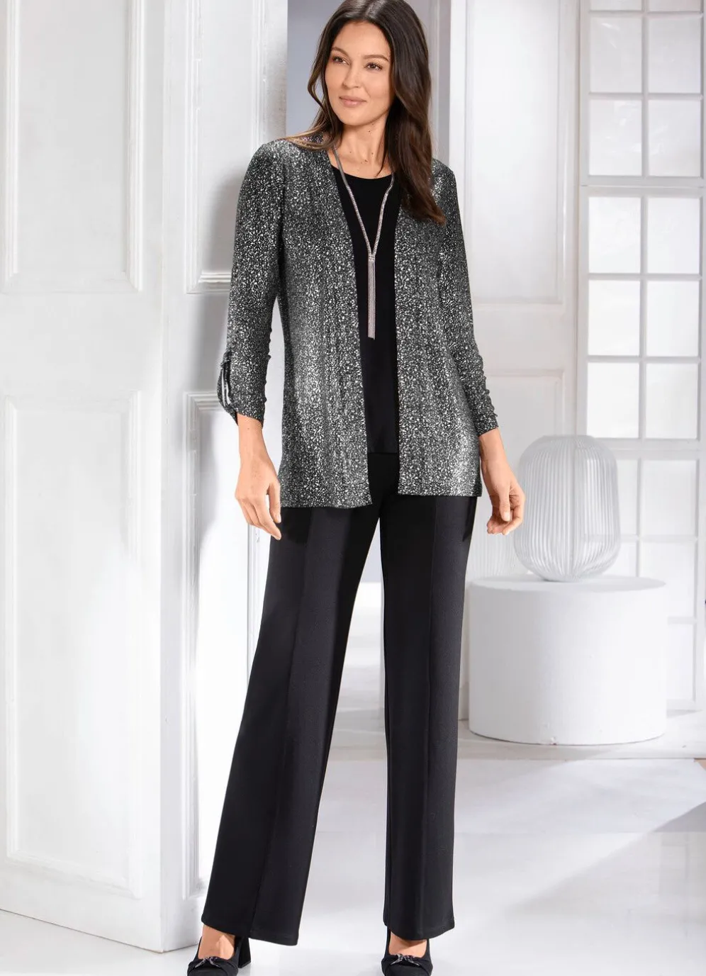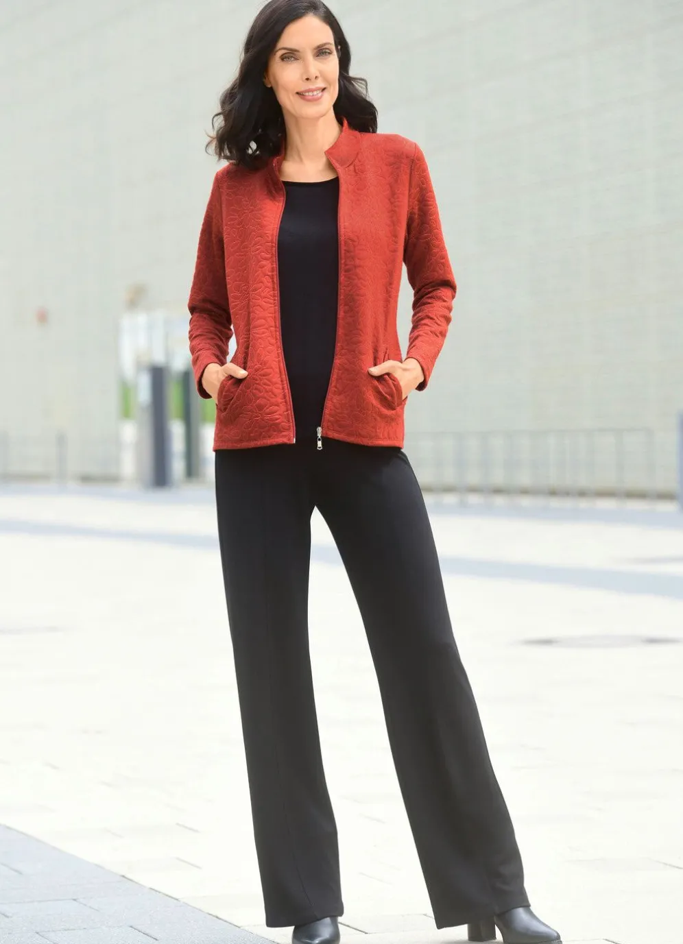 Aktuelle, schwarze Hose in modischer Weite: bequeme Schlupfform, glatt anliegend dank des innenliegenden Rundum-Dehnbundes, figurformende Abnäher unterhalb des Bundes im Rückteil sowie abgesteppte Biesen, die für eine streckende Optik sorgen. Innenbeinlänge ca. 78 cm, Fußweite ab 50 cm.