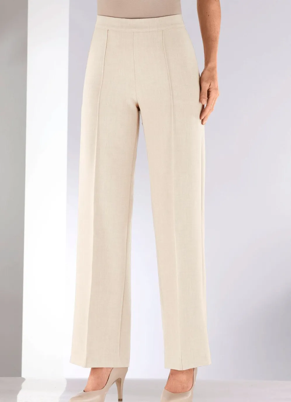 Trendgenaue Hose in modischer Weite von Stilschmiede: komfortable Schlupfform, rückwärtiger Dehnbundeinsatz, vordere, glatte Bundverarbeitung, Seitentaschen, abgesteppte Biesen im Vorderteil. Innenbeinlänge ca. 78 cm. Fußweite ab 52 cm.