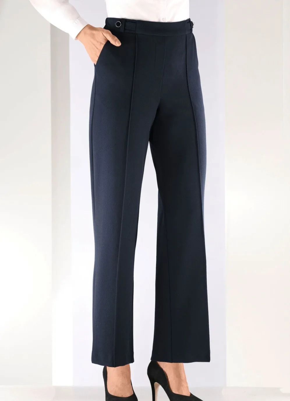 Fabelhafte Hose in modischer Weite: bequeme Schlupfform mit rückwärtigem Dehnbund und vorderer glatter Bundverarbeitung, Gürtelschlaufen, Zierriegel mit dekorativen Knöpfen vorne am Bund, angedeutete Reißverschluss-Zierblende, abgesteppte Biesen, die für eine streckende Optik sorgen sowie Seitentaschen. Innenbeinlänge ca. 78 cm, Fußweite ab 46 cm.