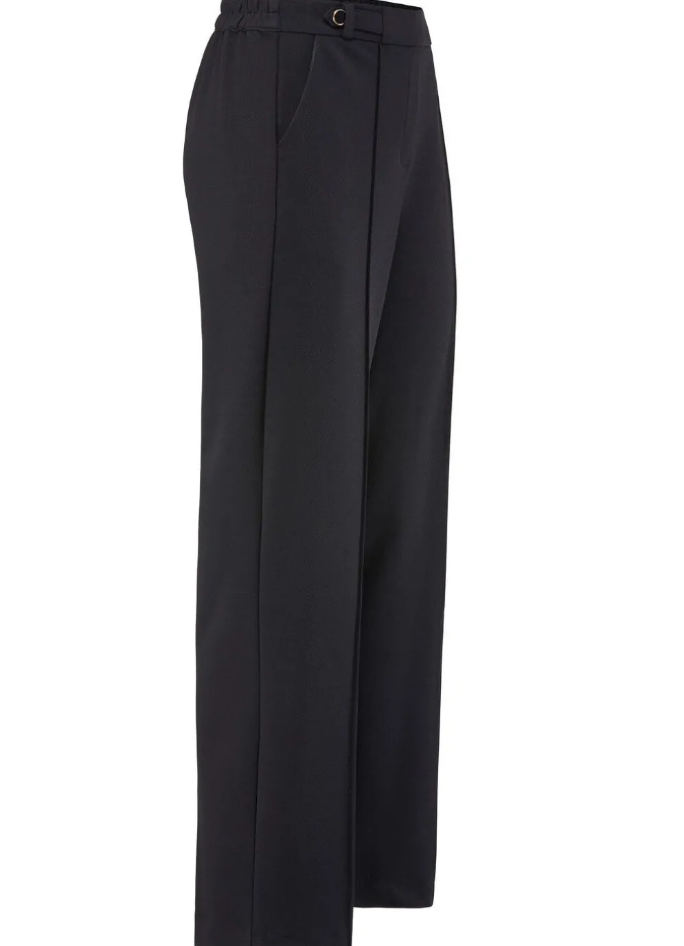 Fabelhafte Hose in modischer Weite: bequeme Schlupfform mit rückwärtigem Dehnbund und vorderer glatter Bundverarbeitung, Gürtelschlaufen, Zierriegel mit dekorativen Knöpfen vorne am Bund, angedeutete Reißverschluss-Zierblende, abgesteppte Biesen, die für eine streckende Optik sorgen sowie Seitentaschen. Innenbeinlänge ca. 78 cm, Fußweite ab 46 cm.