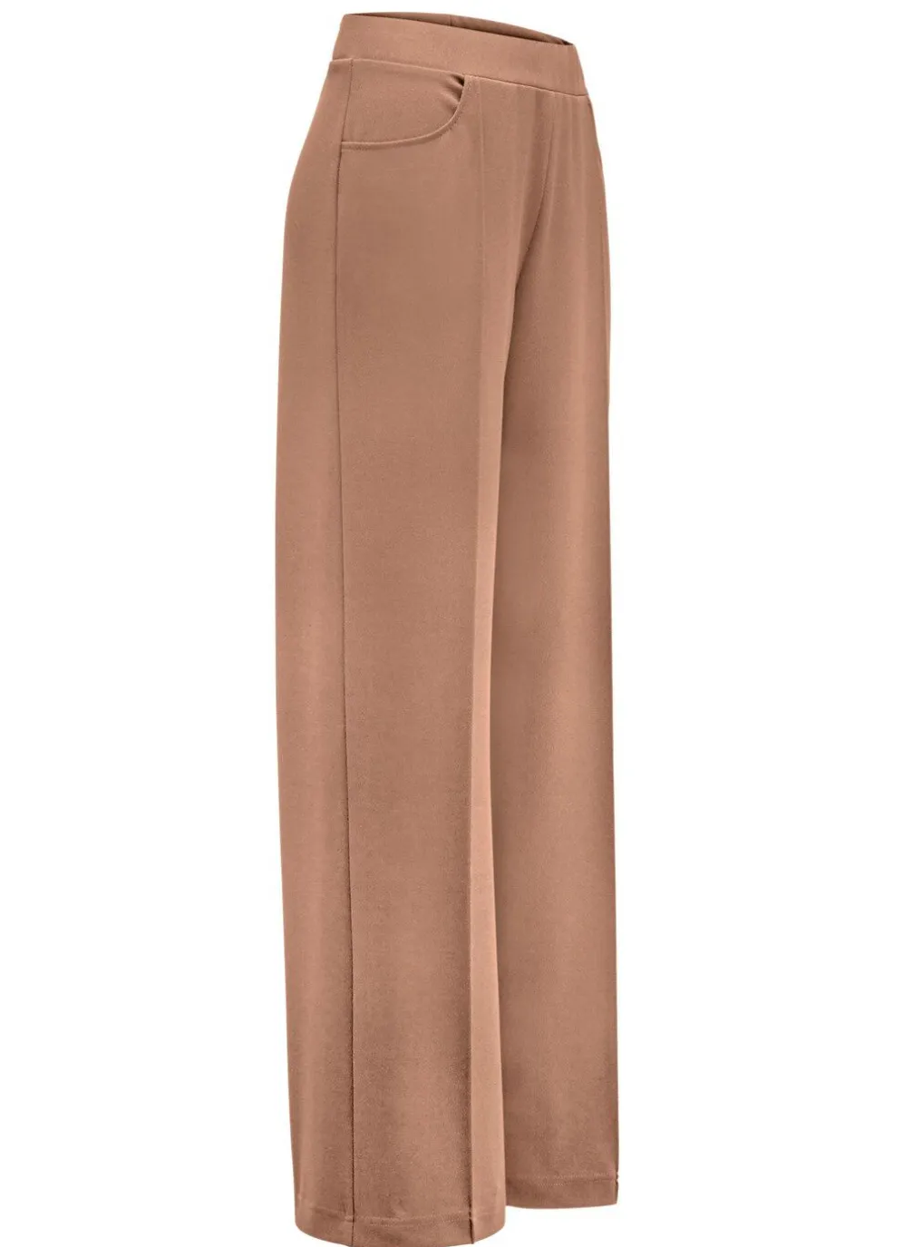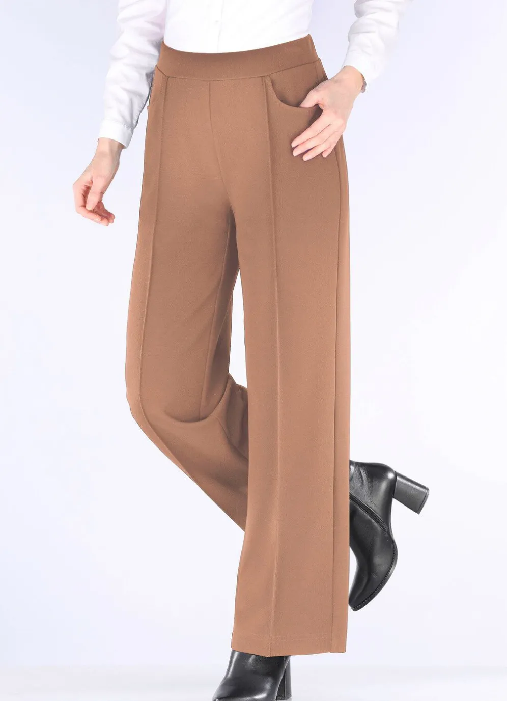 Trendgenaue Hose in modischer Weite: bequeme Schlupfform, glatt anliegend dank des innenliegenden Rundum-Dehnbundes, abgesteppte Biesen, die für eine streckende Optik sorgen sowie Seitentaschen. Innenbeinlänge ca. 76 cm, Fußweite ab 54 cm.