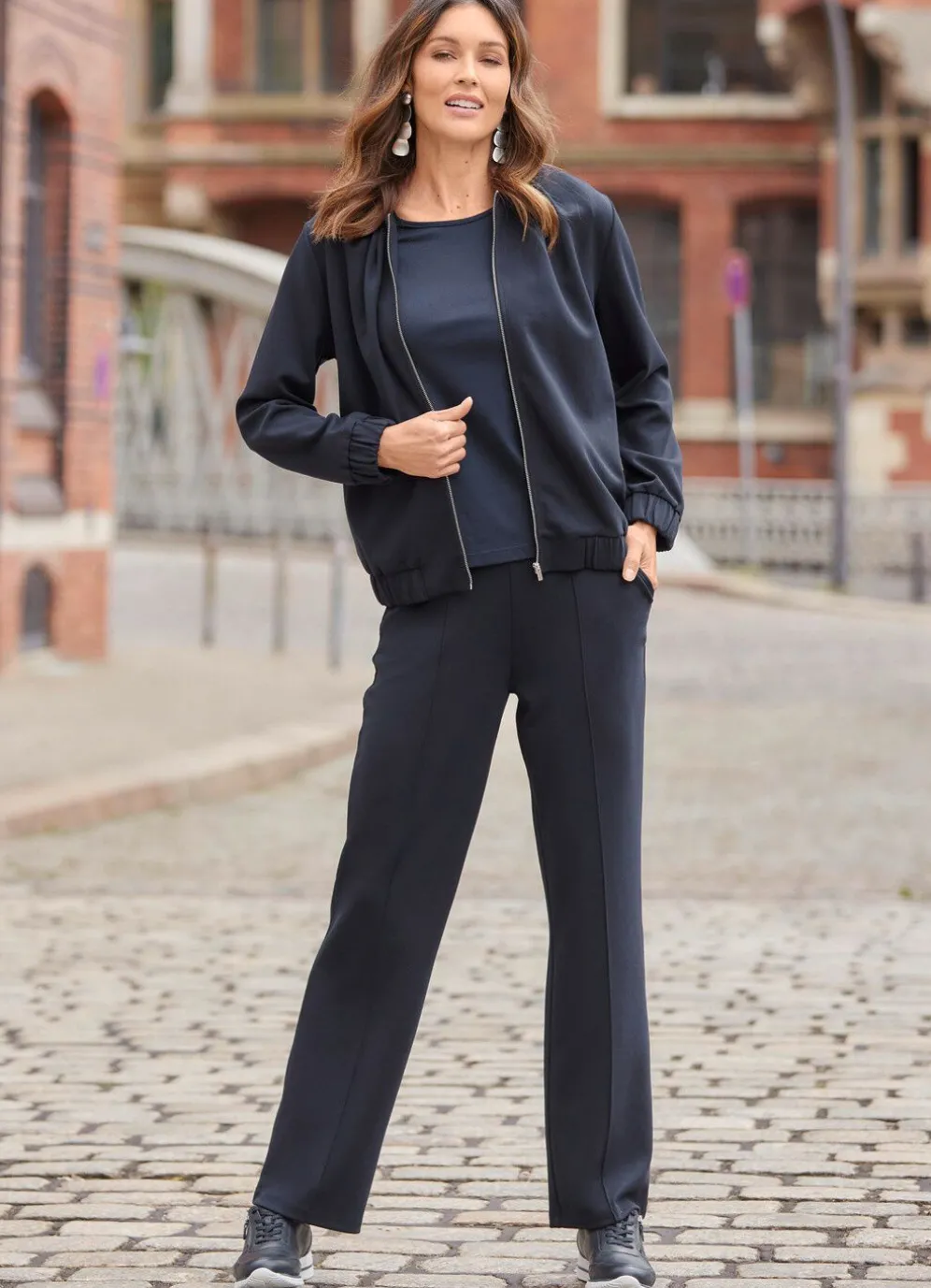 Fabelhafte Hose in modischer Weite von Stilschmiede: bequeme Schlupfform, glatt anliegend dank des innenliegenden Rundum-Dehnbundes, abgesteppte Biesen, die für eine streckende Optik sorgen, Seitentaschen sowie angedeutete paspelierte Gesäßtaschen. Innenbeinlänge ca. 78 cm, Fußweite ab 46 cm
