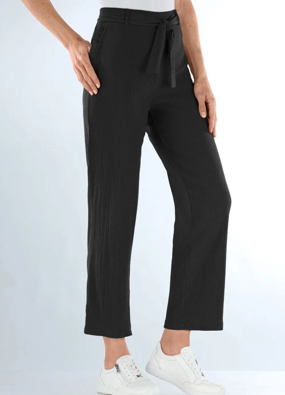 Flotte, knöchellange Hose: in Schlupfform, glatt anliegend dank der innenliegenden Gummibund-Einlage, Gürtelschlaufen, Bindeband sowie Seitentaschen mit Zierknöpfen. Innenbeinlänge ca. 76 cm, Fußweite ab 46 cm.