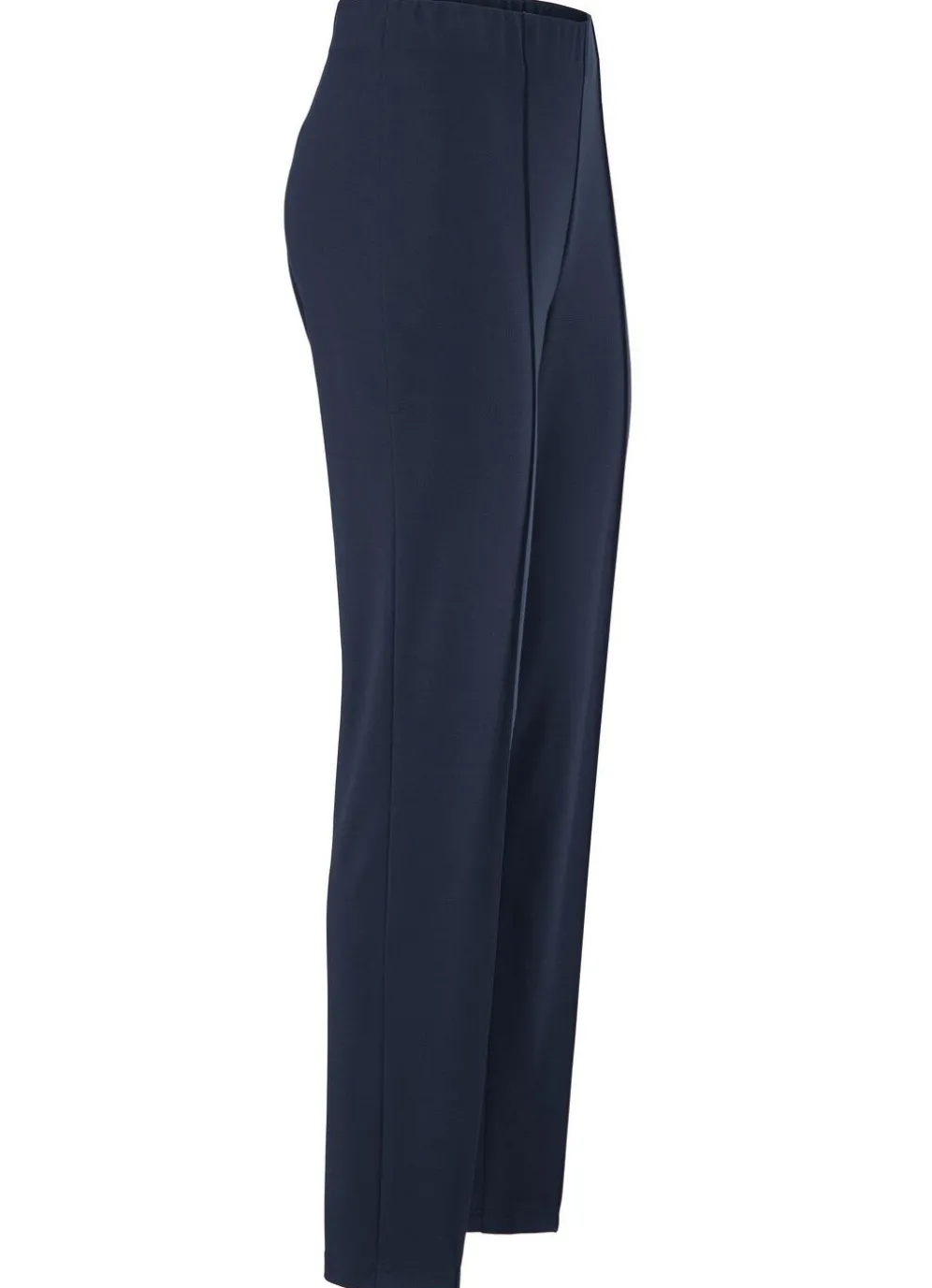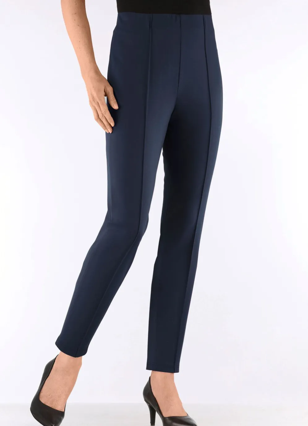 Knöchellange Hose mit angeschnittenem Bund, glatt anliegend dank der innenliegenden Gummibund-Einlage sowie abgesteppte Biesen im Vorderteil. Innenbeinlänge ca. 71 cm, Fußweite ab 30 cm.