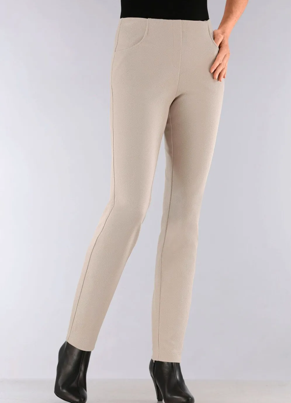 Attraktive Hose mit angeschnittenem Bund: in bequemer Schlupfform, glatt anliegend dank des innenliegenden Rundum-Dehnbundes, angedeutete Reißverschlusszierblende sowie Seitentaschen. Innenbeinlänge ca. 79 cm, Fußweite ab 30 cm.