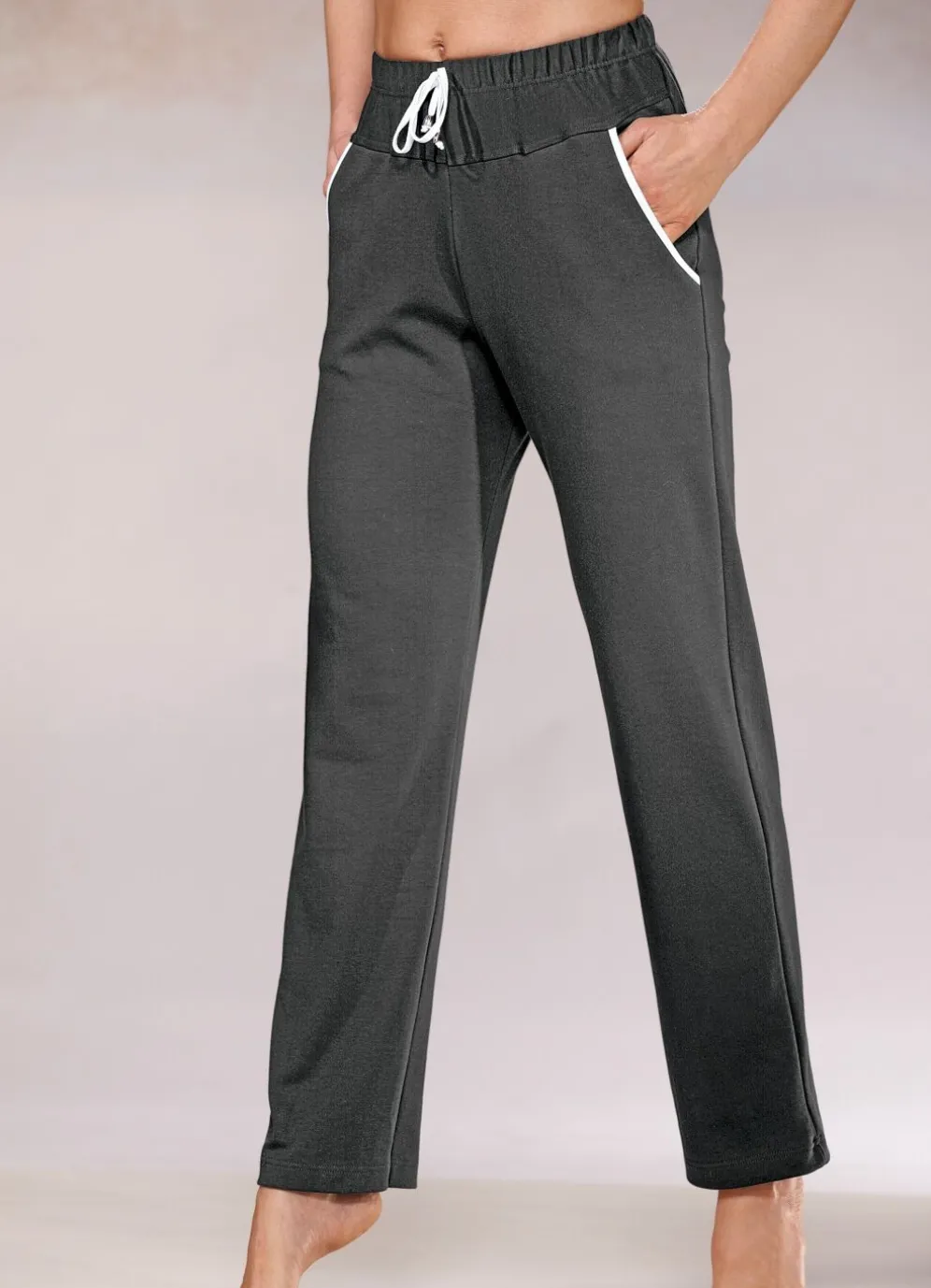 Interessante Hose in langer Form, mit kontrastfarbenem Zierband am bequemen Dehnbund sowie weißer Paspelierung an den beiden Schubtaschen.