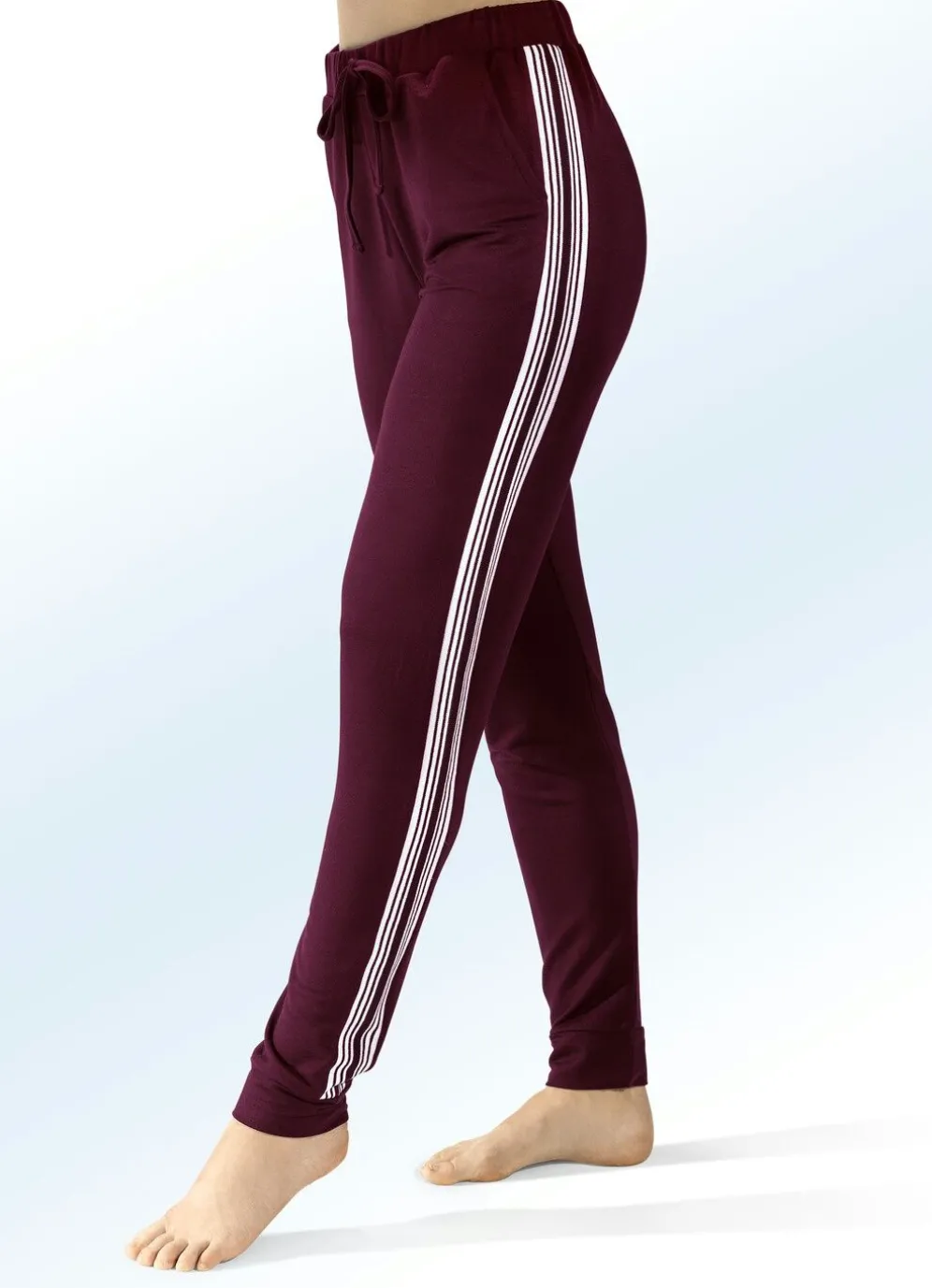 Flotte Plantier-Hose: lange, gerade Form, mit Dehnbund rundum, Tunnelzugband, zwei Seitennahttaschen, weiße Kontrasteinsätze entlang der Seitennaht sowie breiten Bündchen an den Beinabschlüssen.