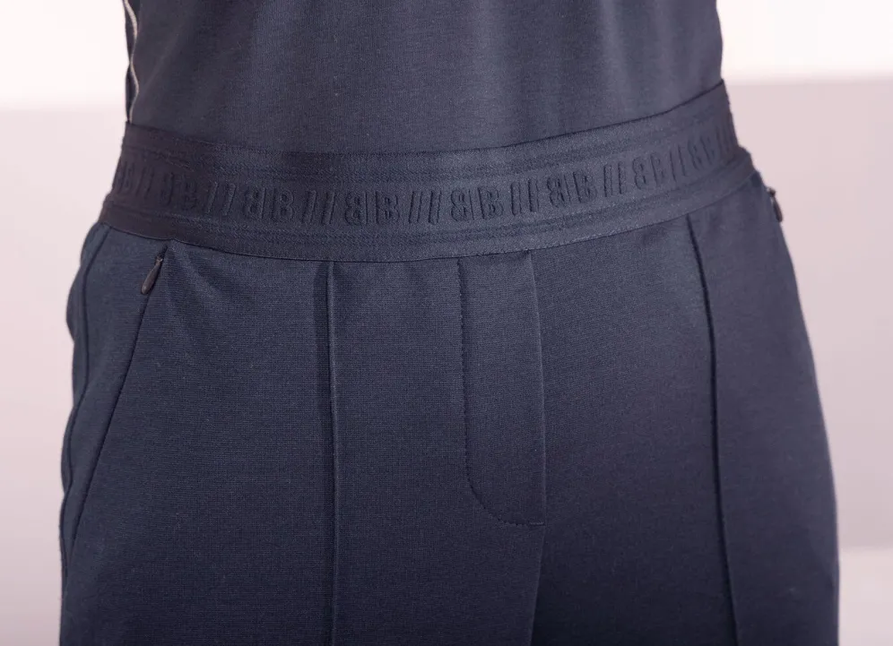 Aktuelle, marinefarbene Hose von B/ANCA in modischer Weite: bequeme Schlupfform, glatt anliegend dank des Rundum-Dehnbundes, Biesen im Vorderteil die für eine streckende Optik sorgen, Seitentaschen mit Reißverschluss sowie angedeutete Reißverschluss-Zierblende im Vorderteil.