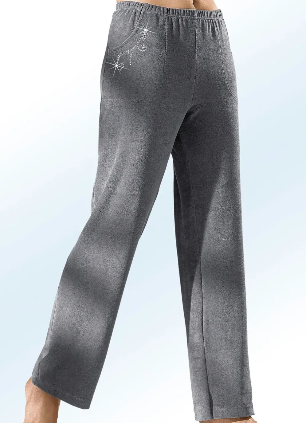 Tragangenehme Hose in langer, gerader Form, mit bequemem Dehnbund rundum sowie zwei Seitennahttaschen mit hübscher Schmucksteinzier.