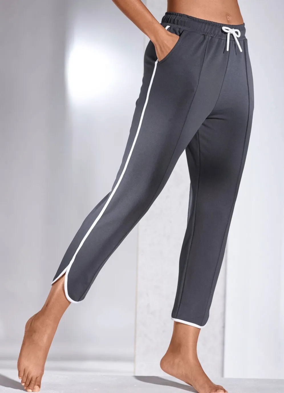 Knöchellange 7/8-Hose von „Laurina” mit bequemem Dehnbund rundum, Tunnelzugband, zwei Seitentaschen, Biesen im Vorder- und Rückteil sowie Kontrastband an den Seitennähten und am abge- rundeten Saum.